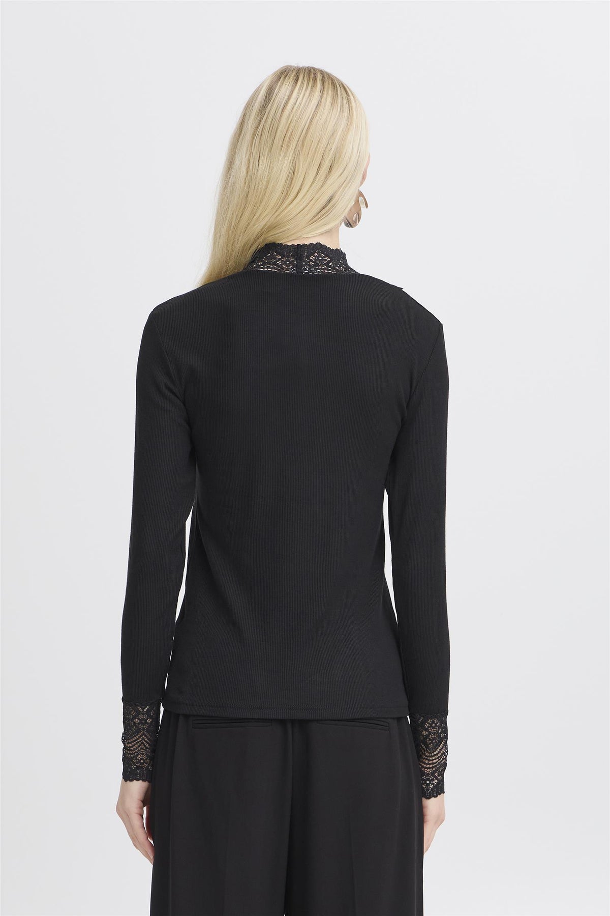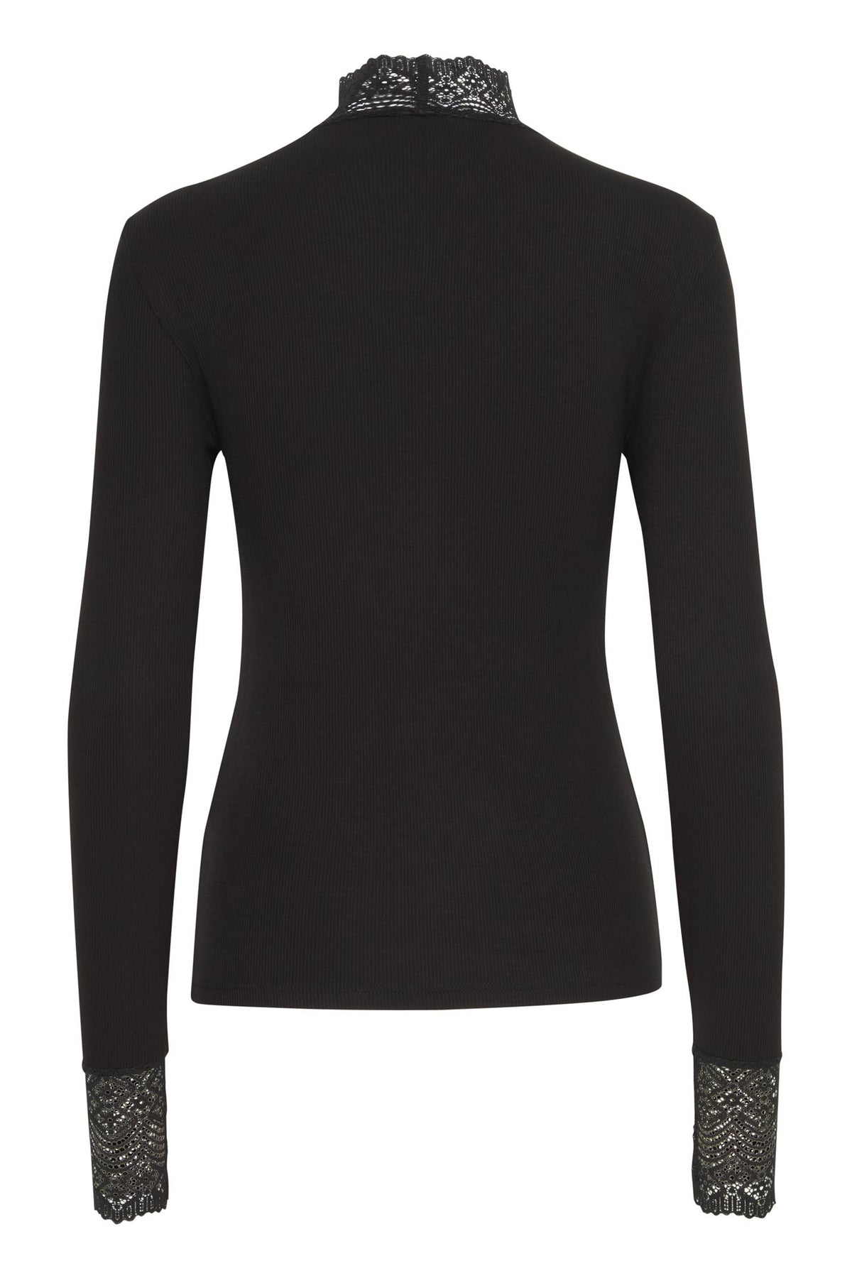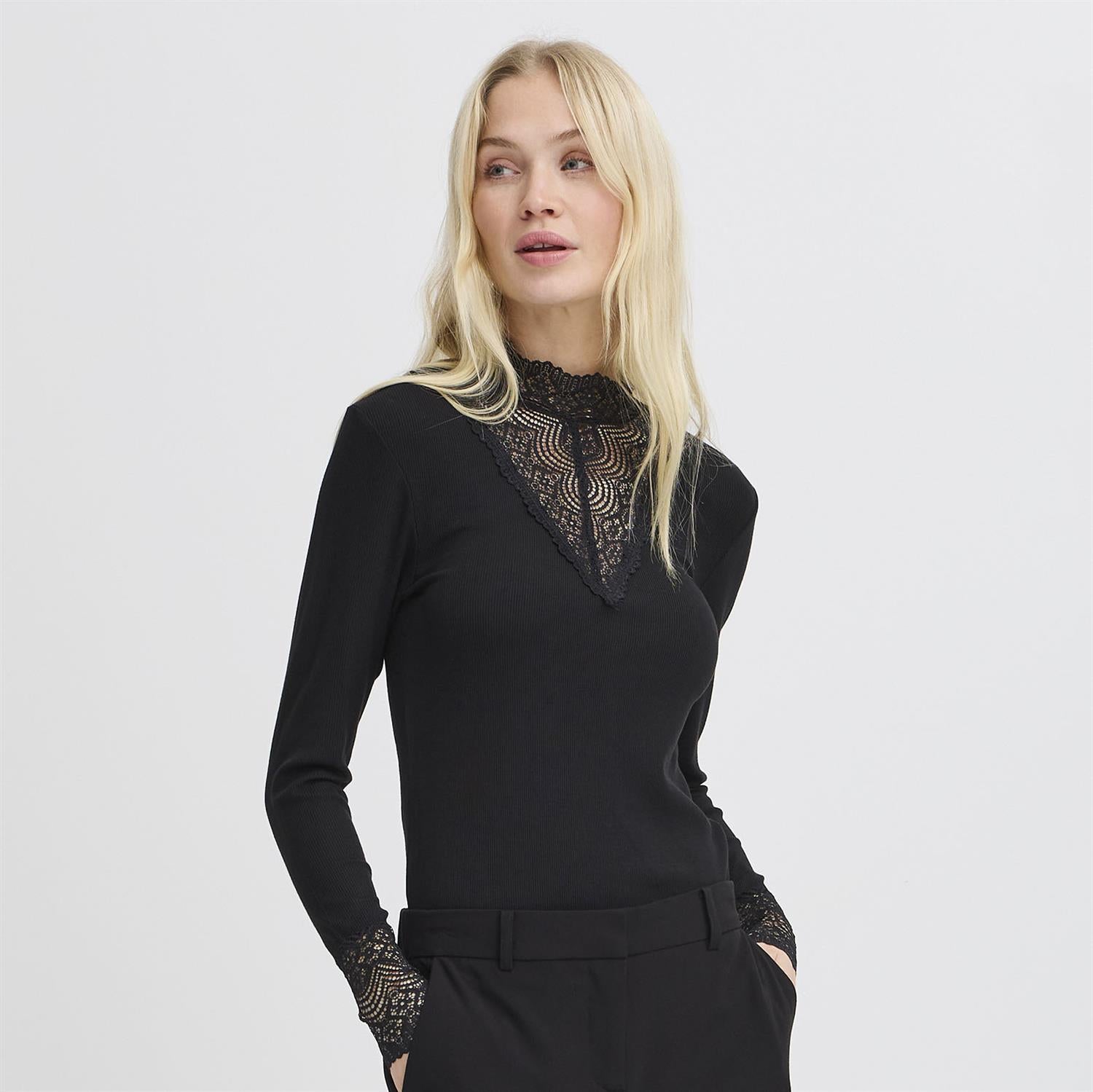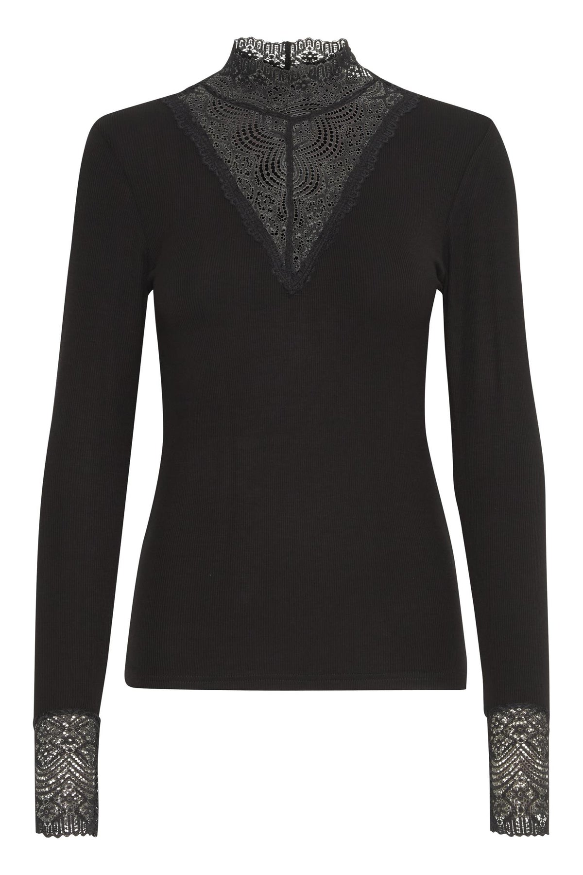 Delikat langermet blondetopp med smal passform, høy hals og transparent V-formet blondedetalj foran. Perfekt å bruke alene eller under blazer, cardigans og vester.