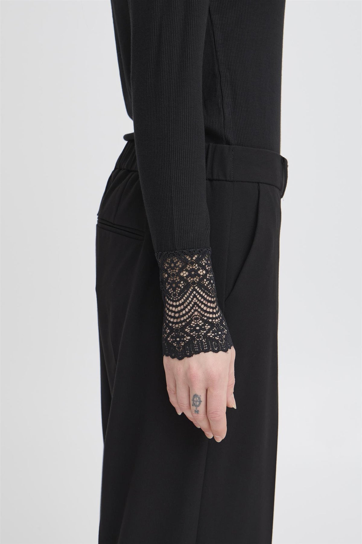 Deilig ribbestruktur og blondeslutt på ermene.