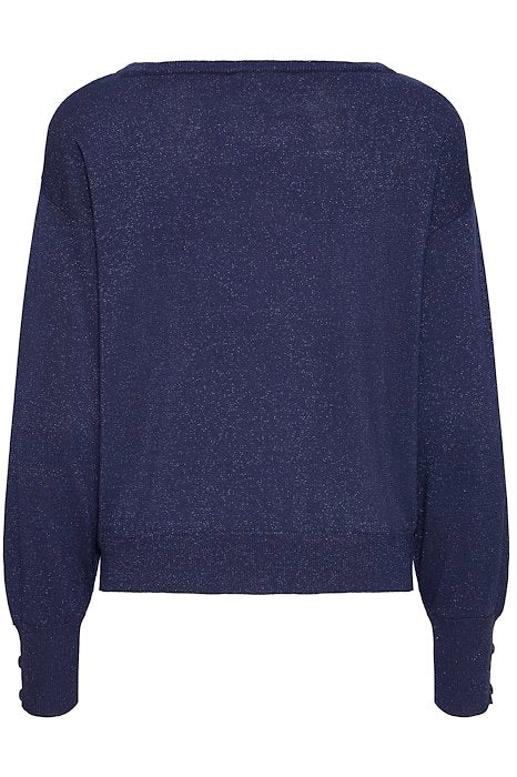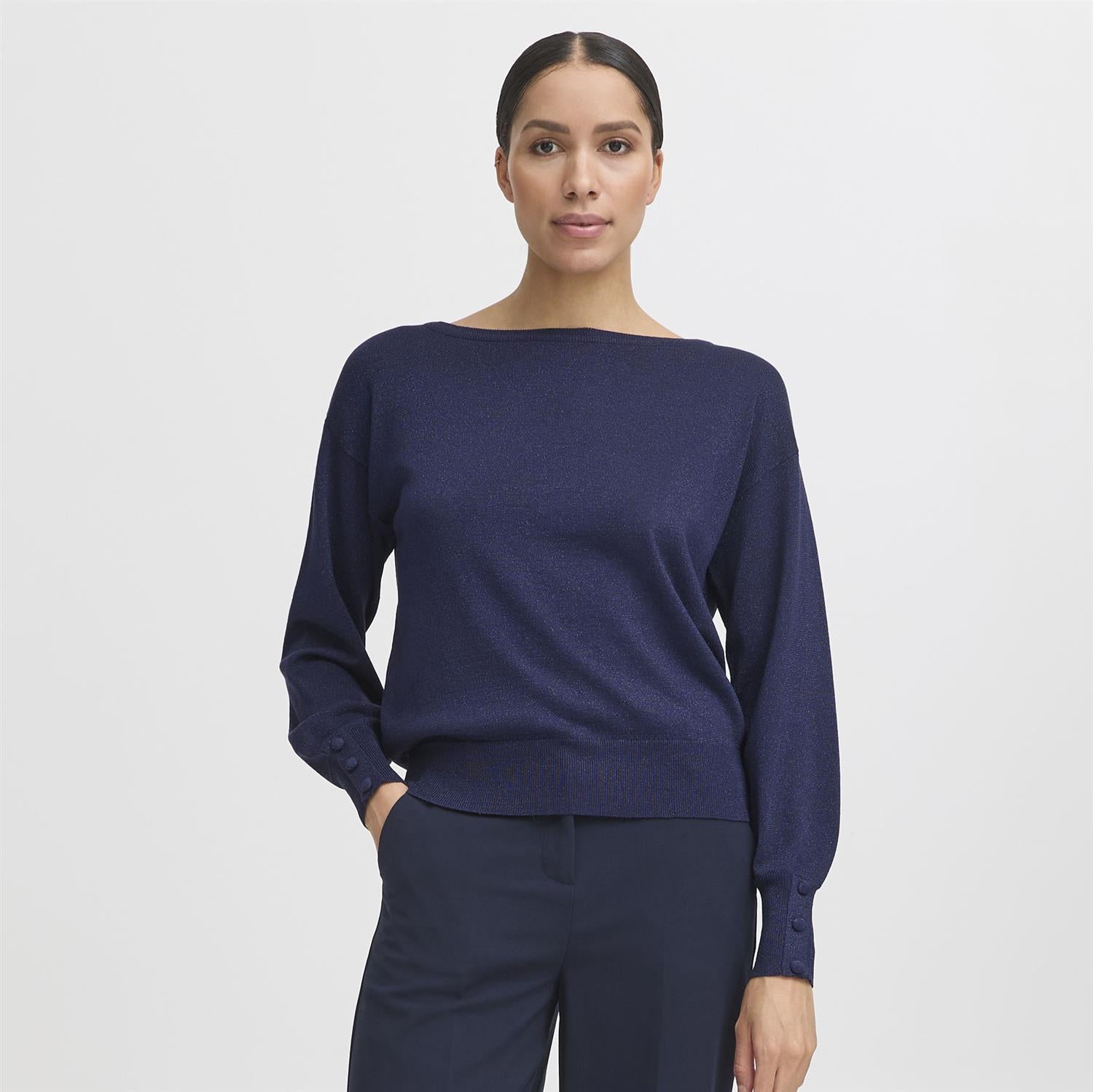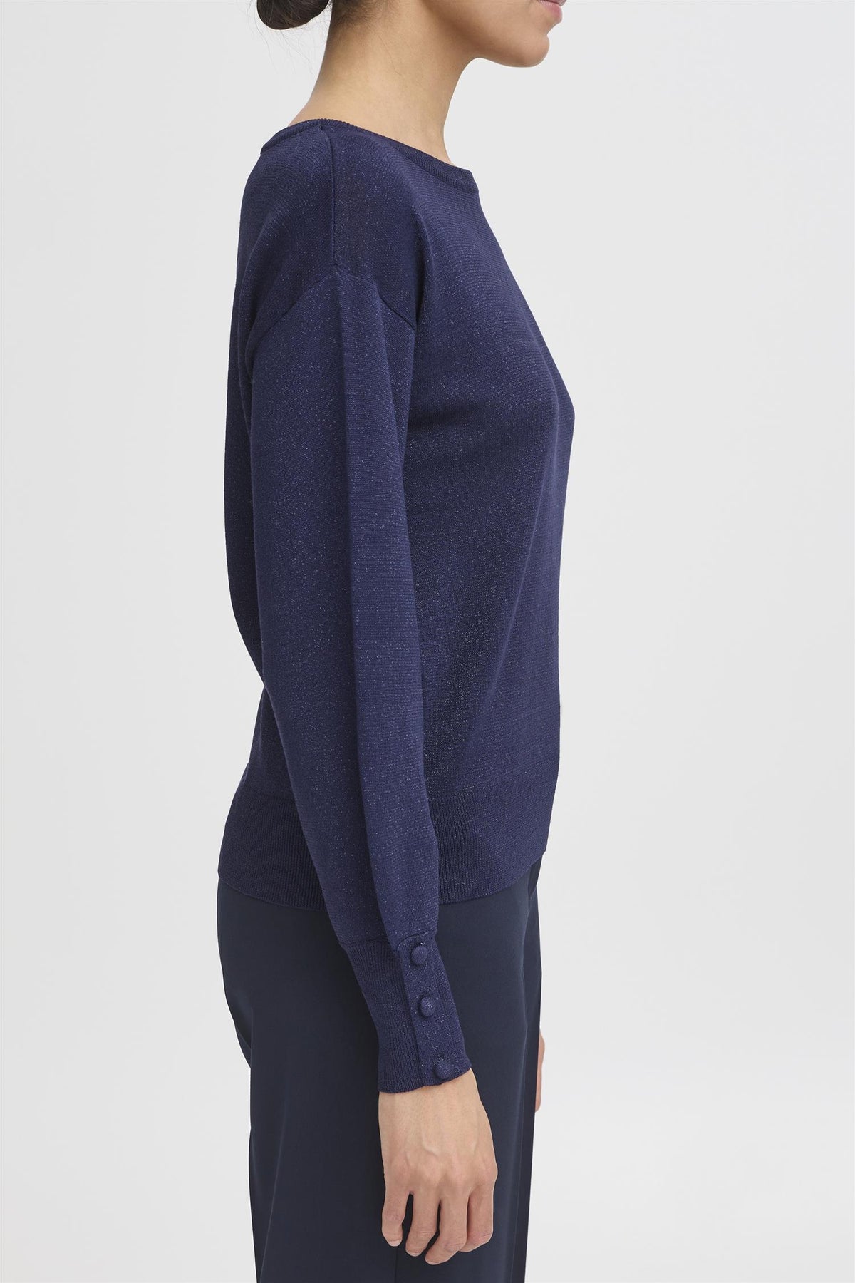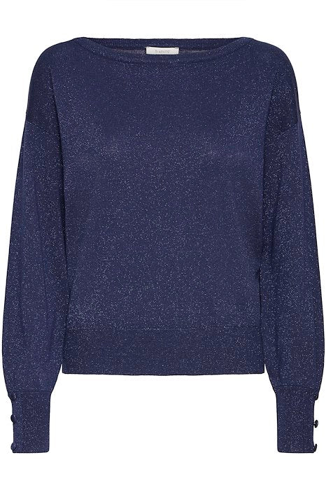 Skimrende genser i strikket materiale med løs passform og klassisk båthals. Lange ermer, ribbestrikkede mansjetter med trekte knapper og glitrende detaljer gir denne et ekslusivt uttrykk, men sjekk prisen!