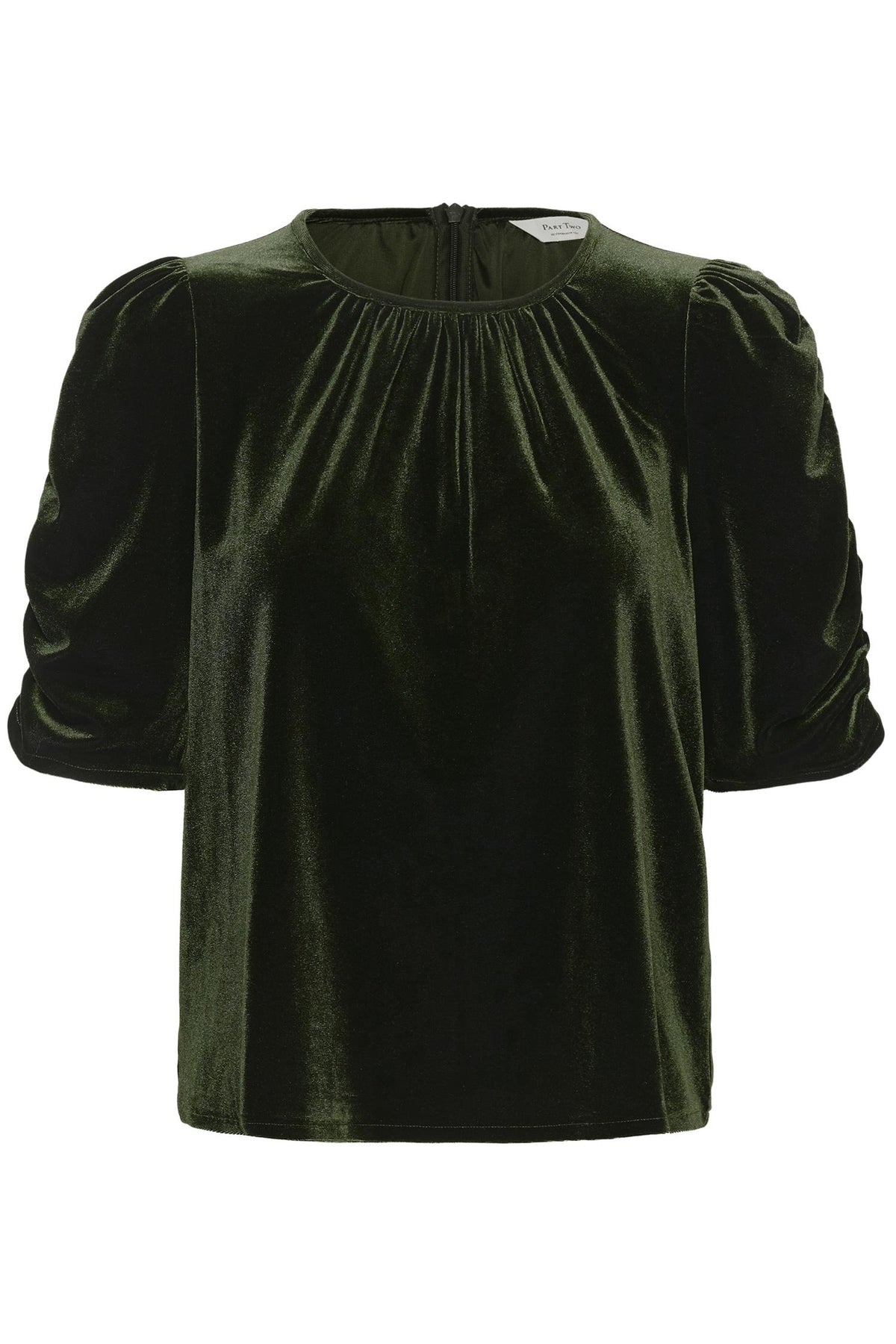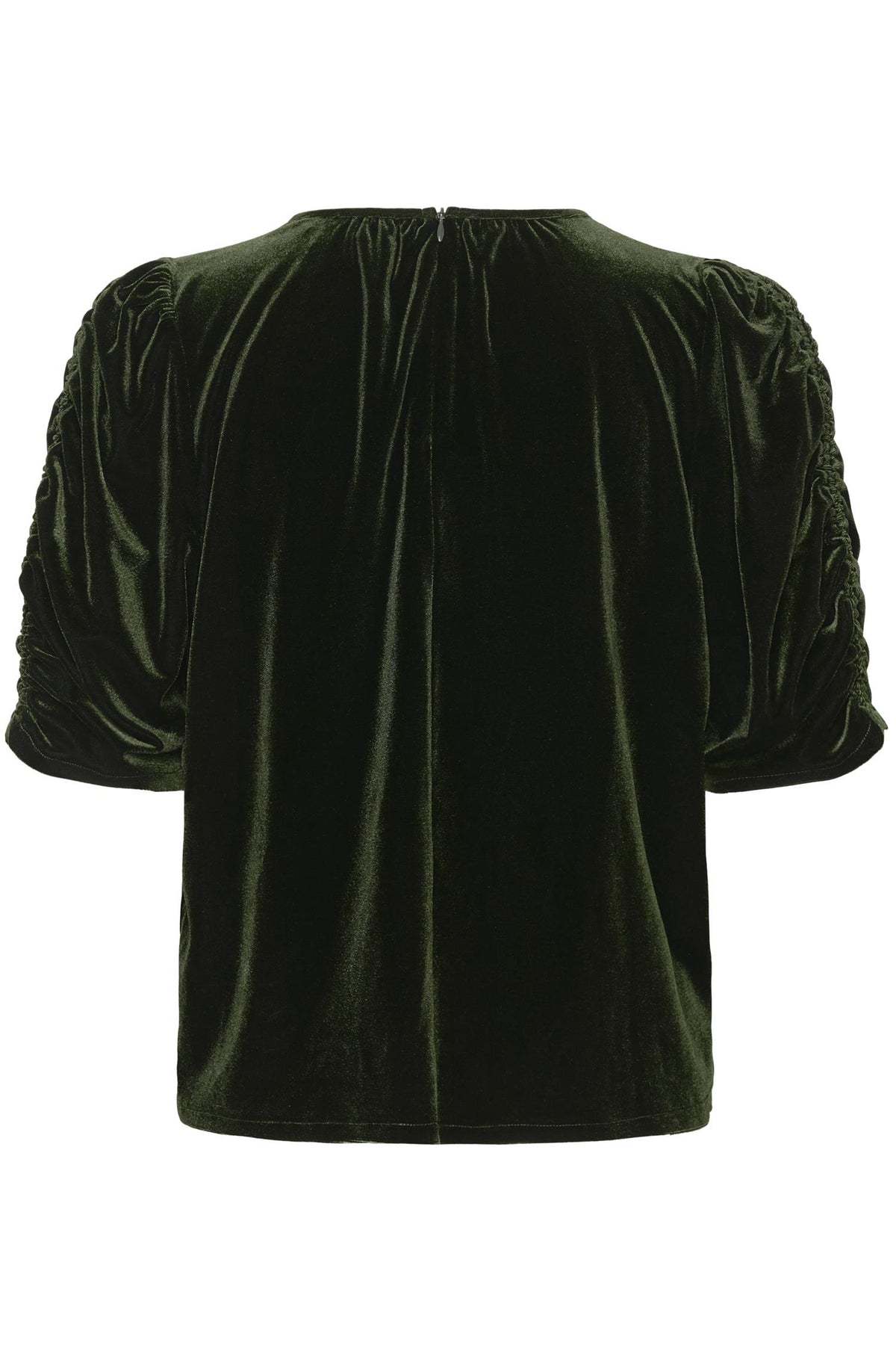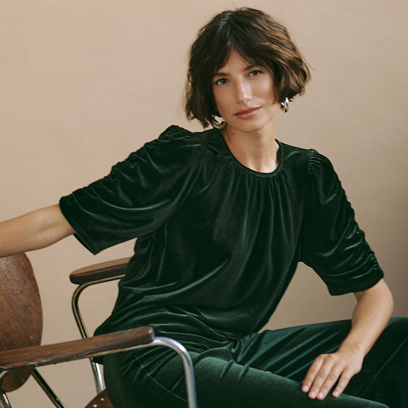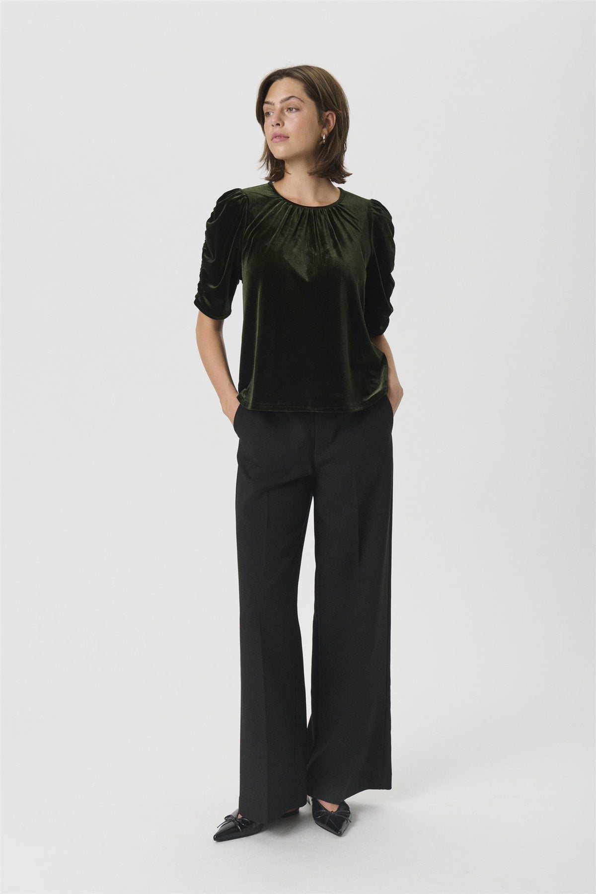 Parrty-bluse i mykeste velouren som kombinerer eleganse og komfort. Den har korte ermer med rynkede detaljer og en lett, avslappet passform som gir et sofistikert uttrykk. Style den med matchende bukser eller skjørt for en enkel, men festklar stil.