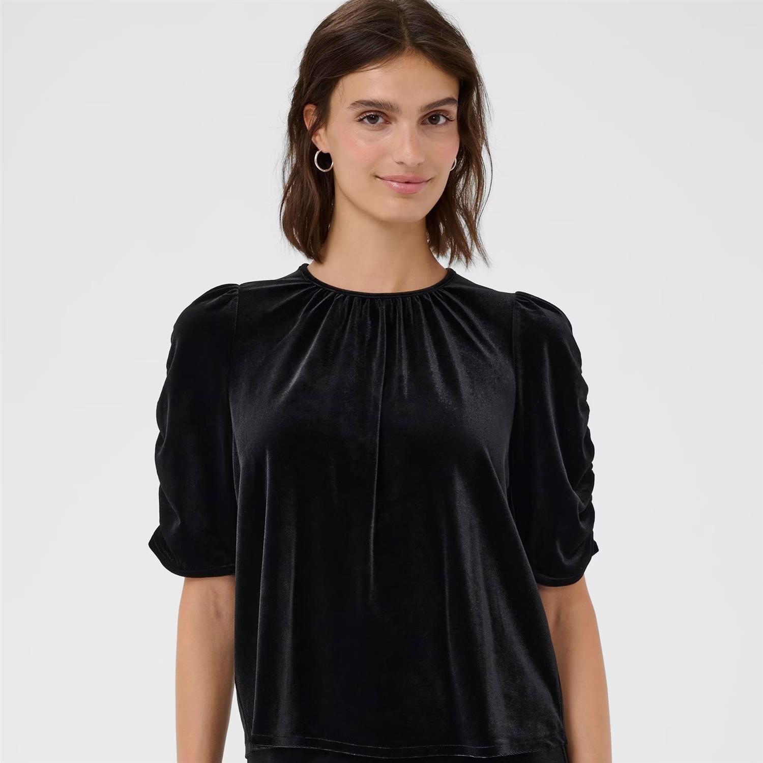 Parrty-bluse i mykeste velouren som kombinerer eleganse og komfort. Den har korte ermer med rynkede detaljer og en lett, avslappet passform som gir et sofistikert uttrykk. Style den med matchende bukser eller skjørt for en enkel, men festklar stil.