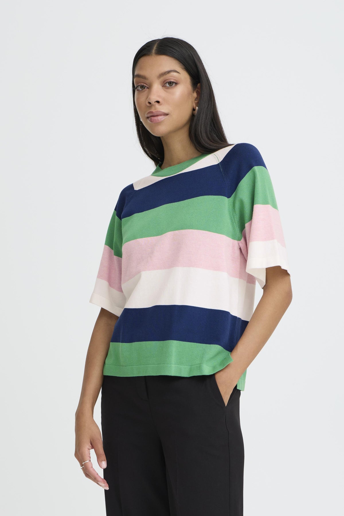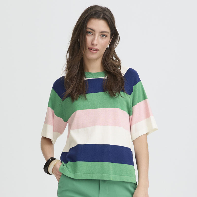 Strikket topp i myk viscose med boksete, romslig passform ogribbestrikket rund hals med droppede skuldersømmer. Stoffet har et jevnt, mykt uttrykk, og de korte ermene er løsere og avsluttes over albuen.