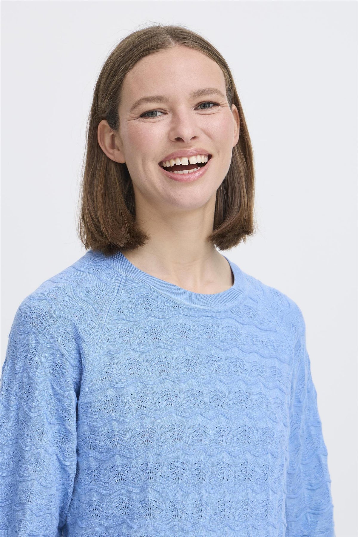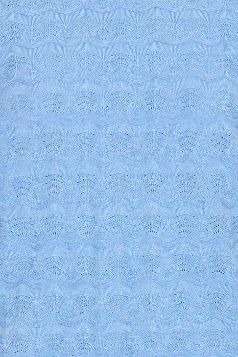 Rund hals med ribbestrikk og helhetlig mønsterstrikk. Ribbekant nederst og på ermene.