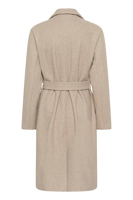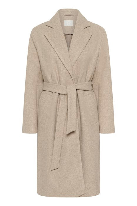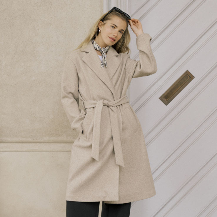 Prisgunstig kåpe med midi lengde, klassisk slag, avtakbart belte og rett silhuett.