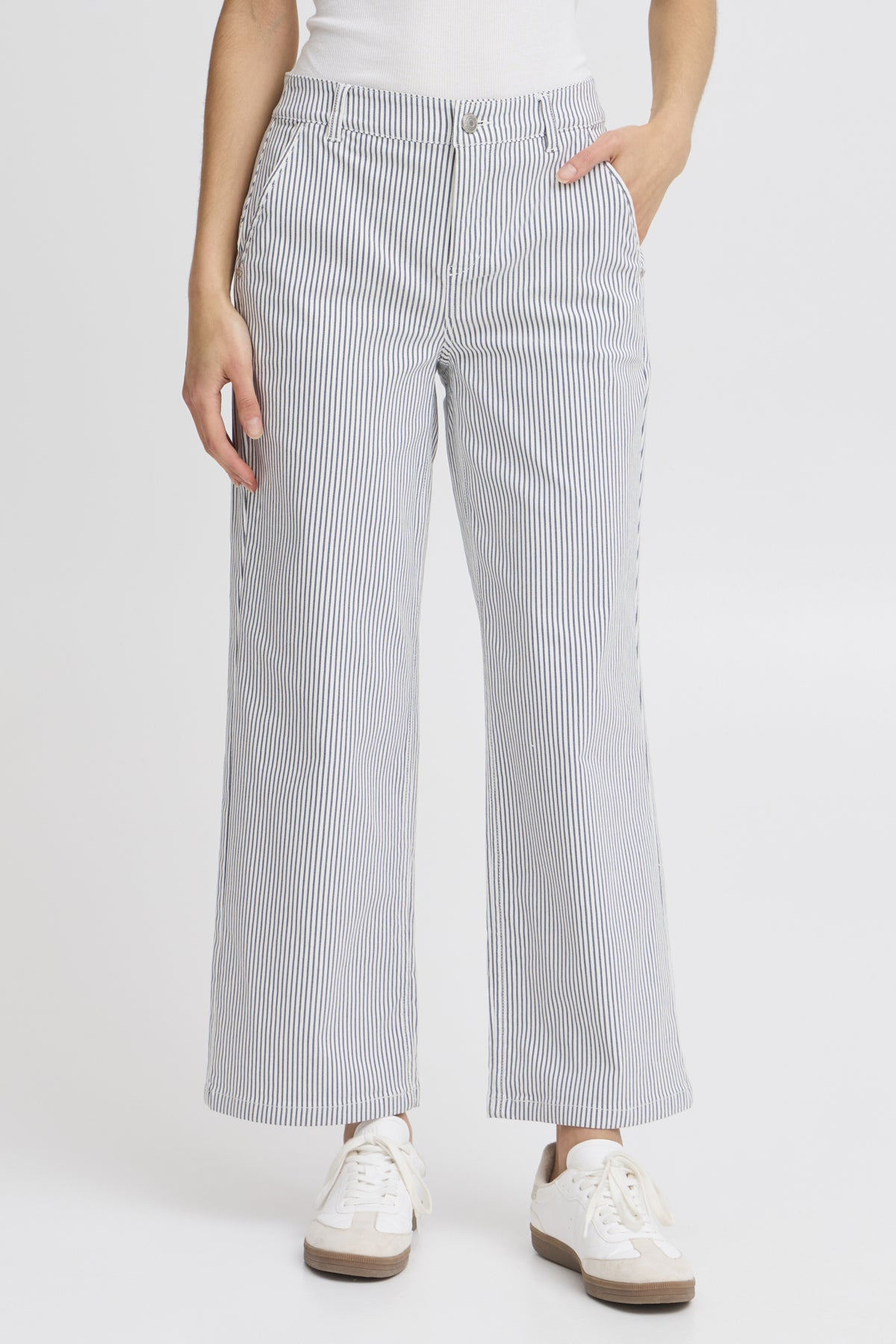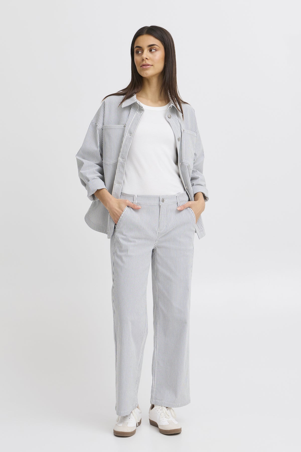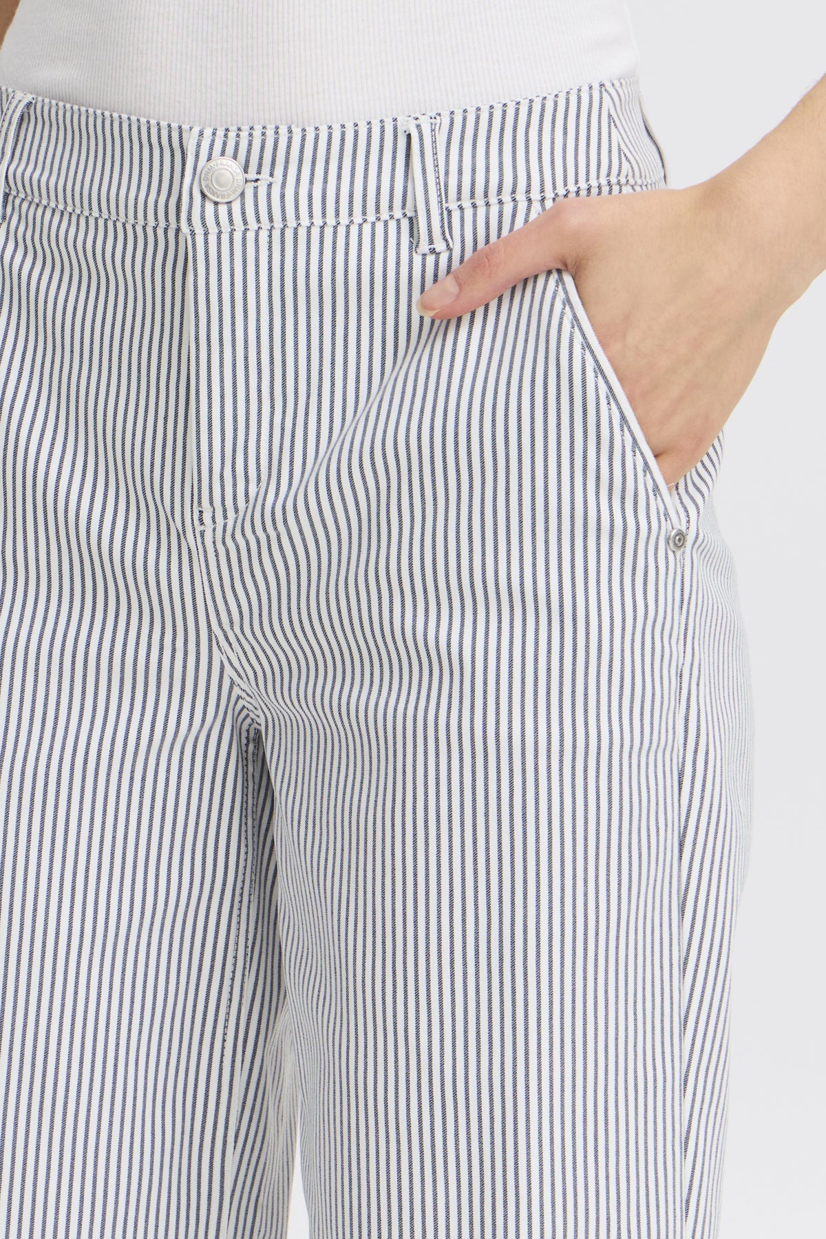 Subtile vertikale striper, sidelommer og knappelukking gir en ren , klassisk samt sporty stil.