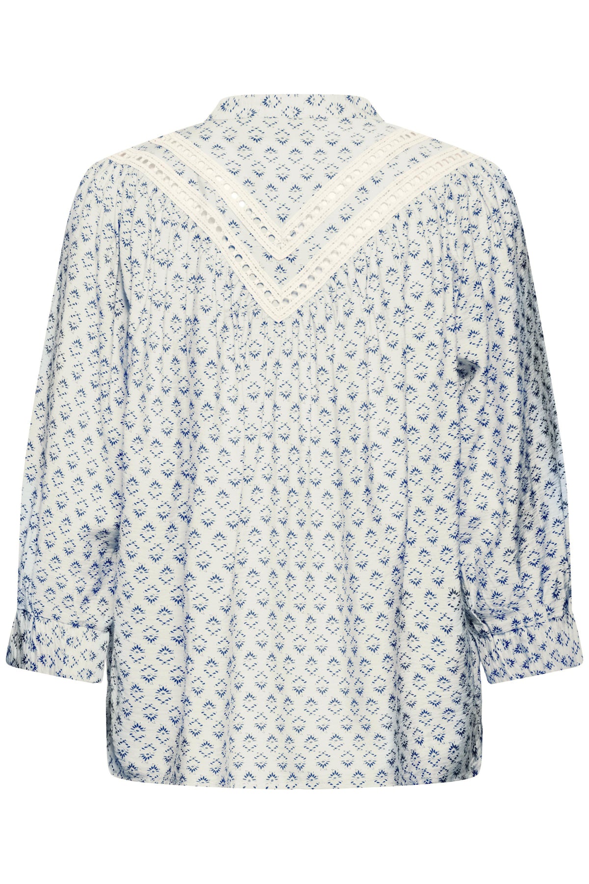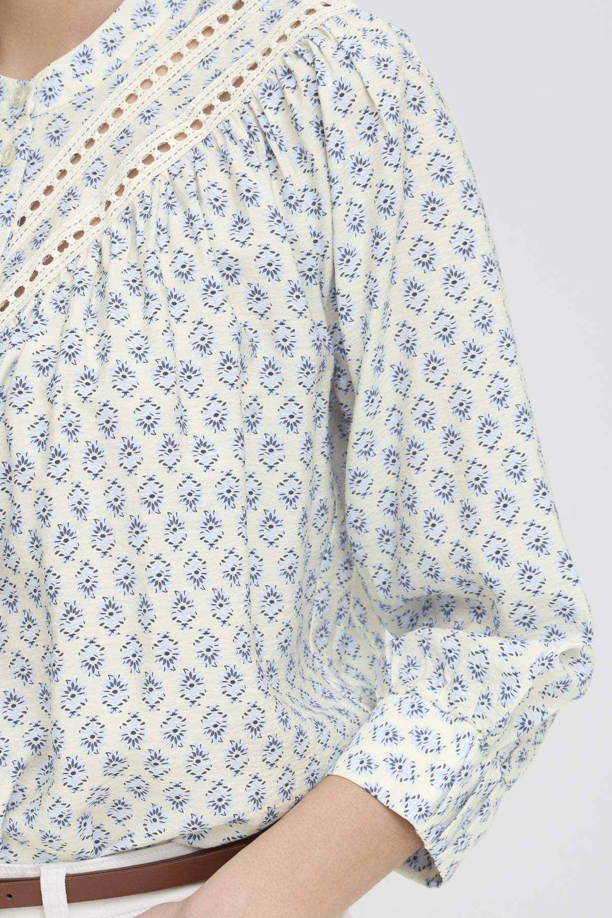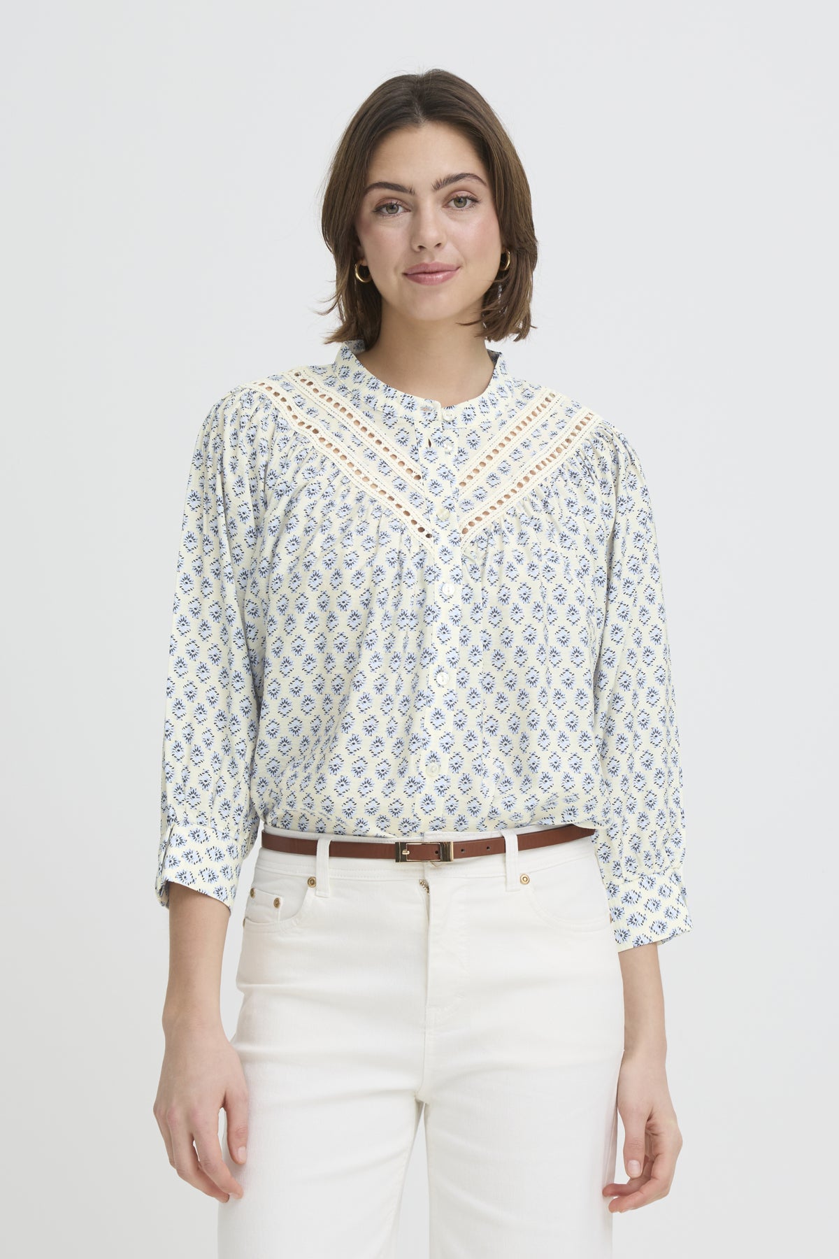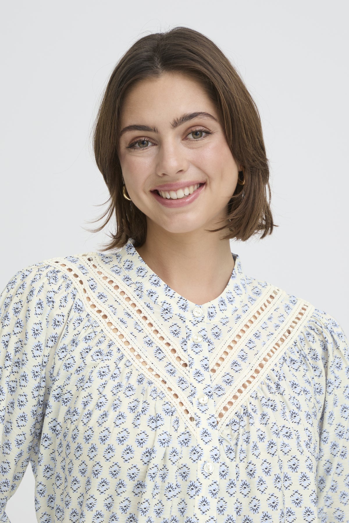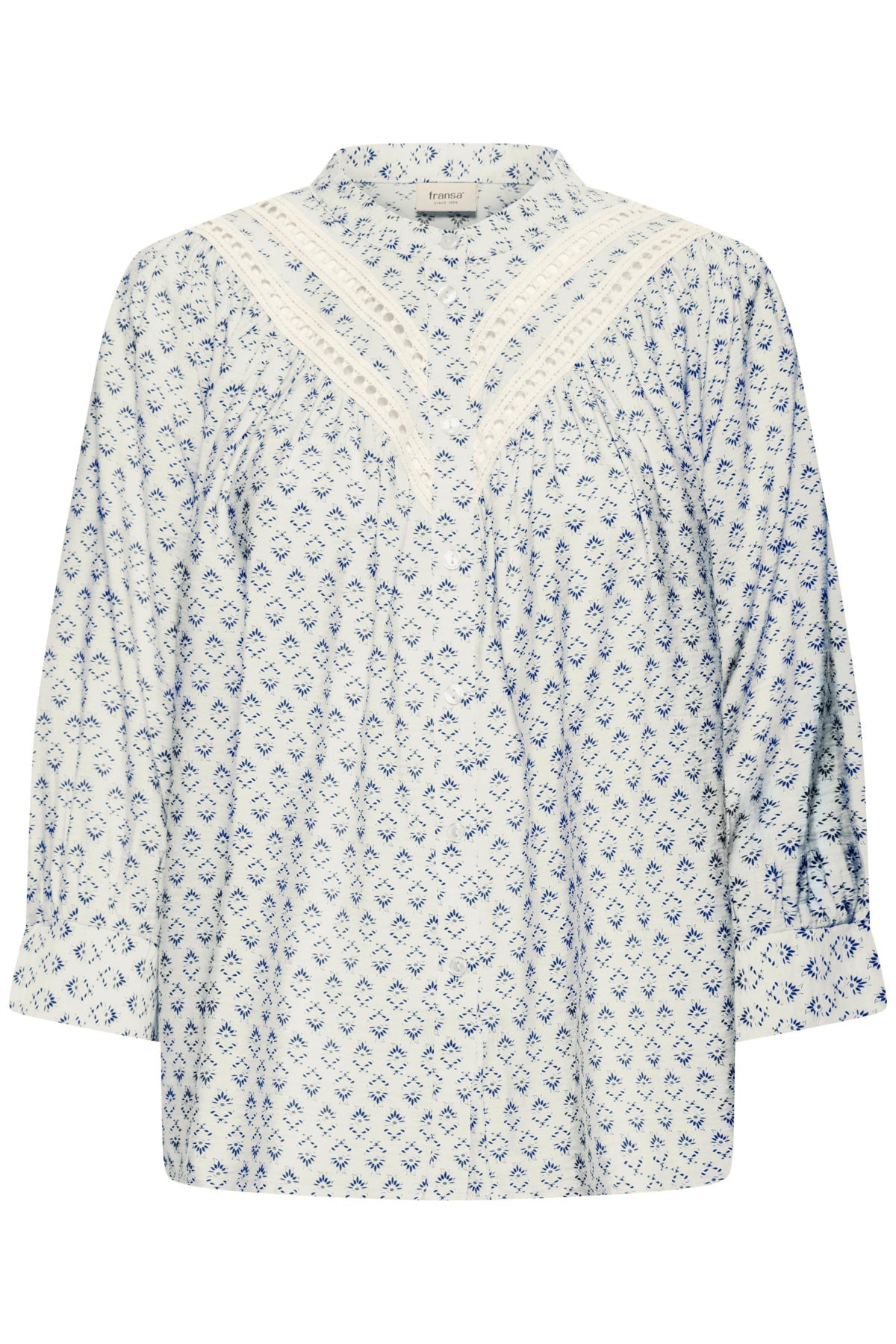 Nydelig og delikat bluse med 3/4 lange ermer, knappestolpe med ton-i-ton knapper.