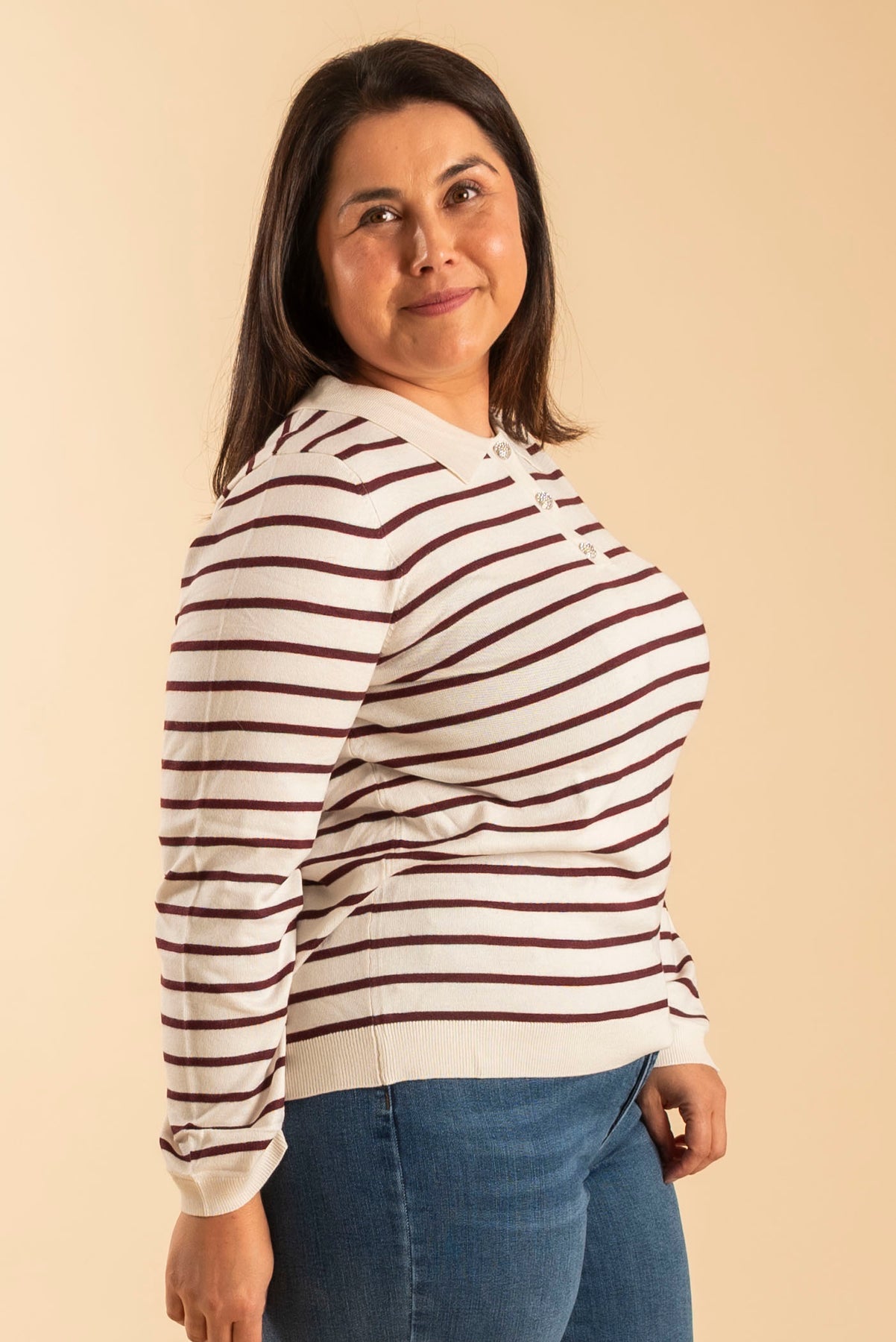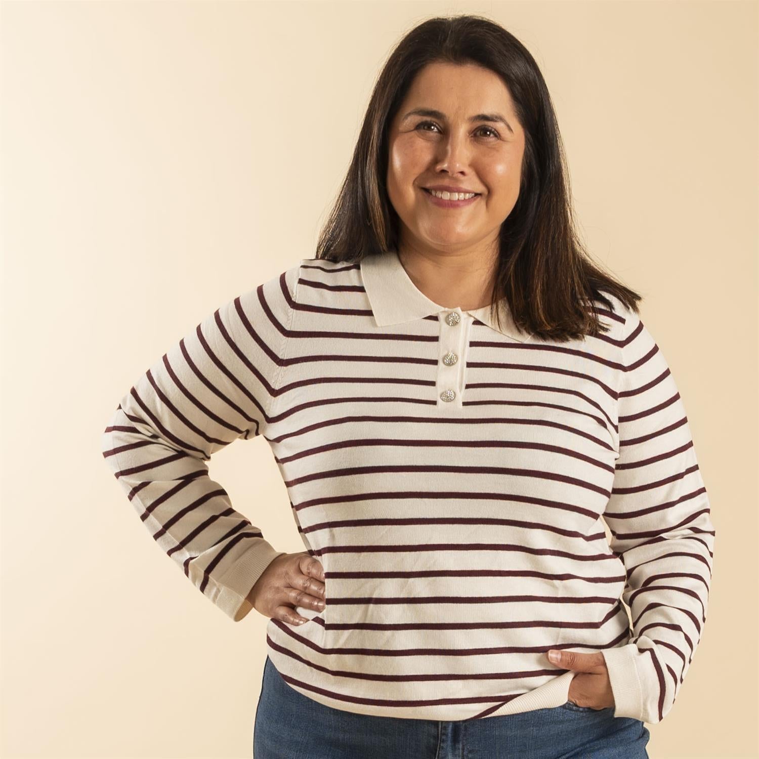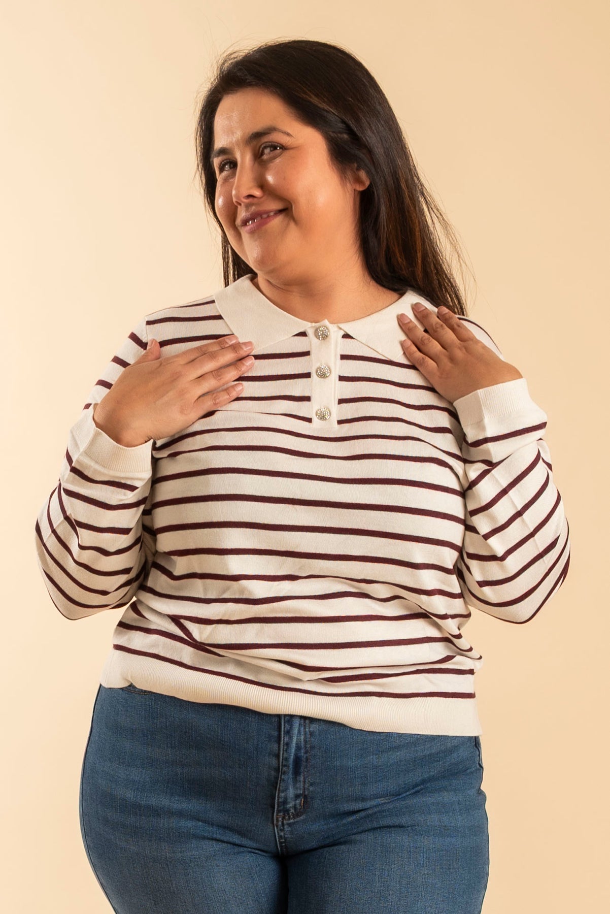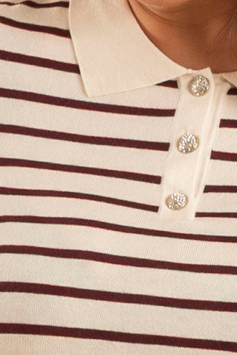 Strikket genser med trendy polo-krage og kort knappestolpe med lekre og skinnende knapper.