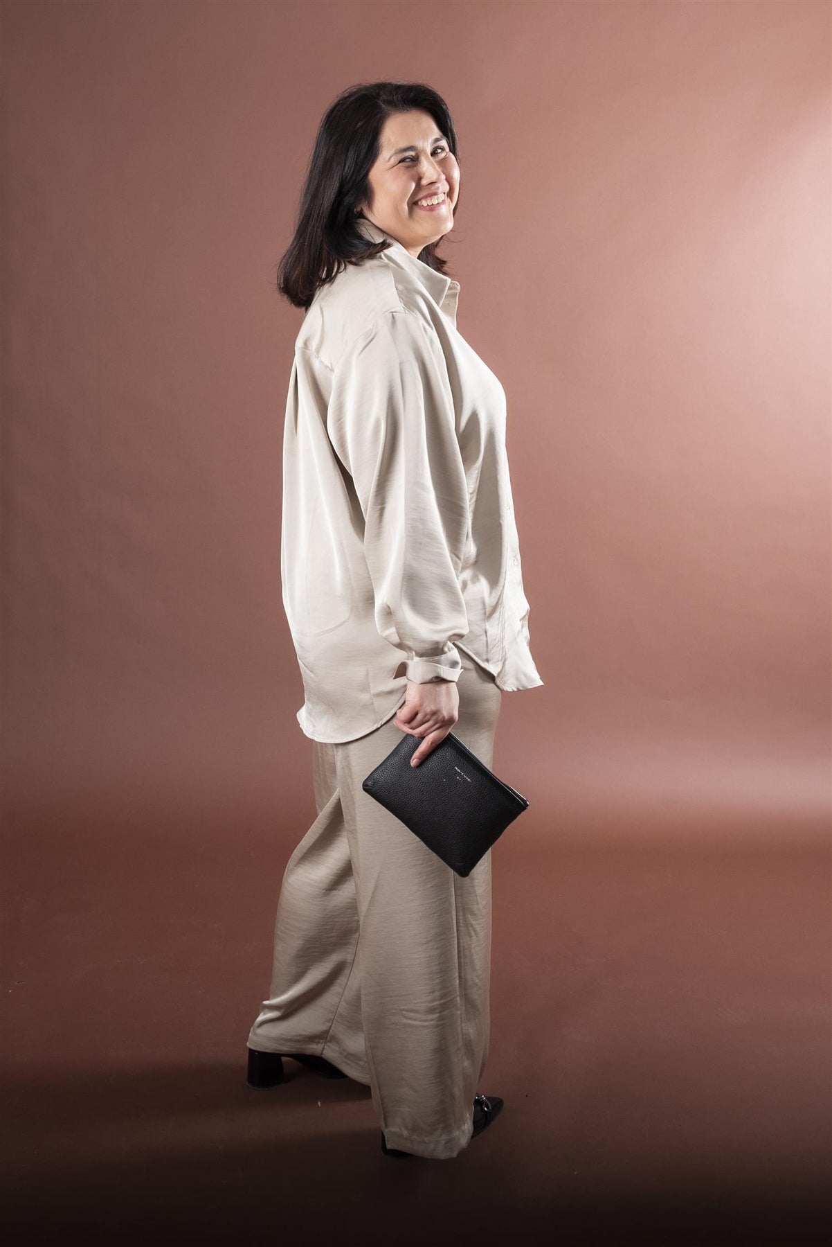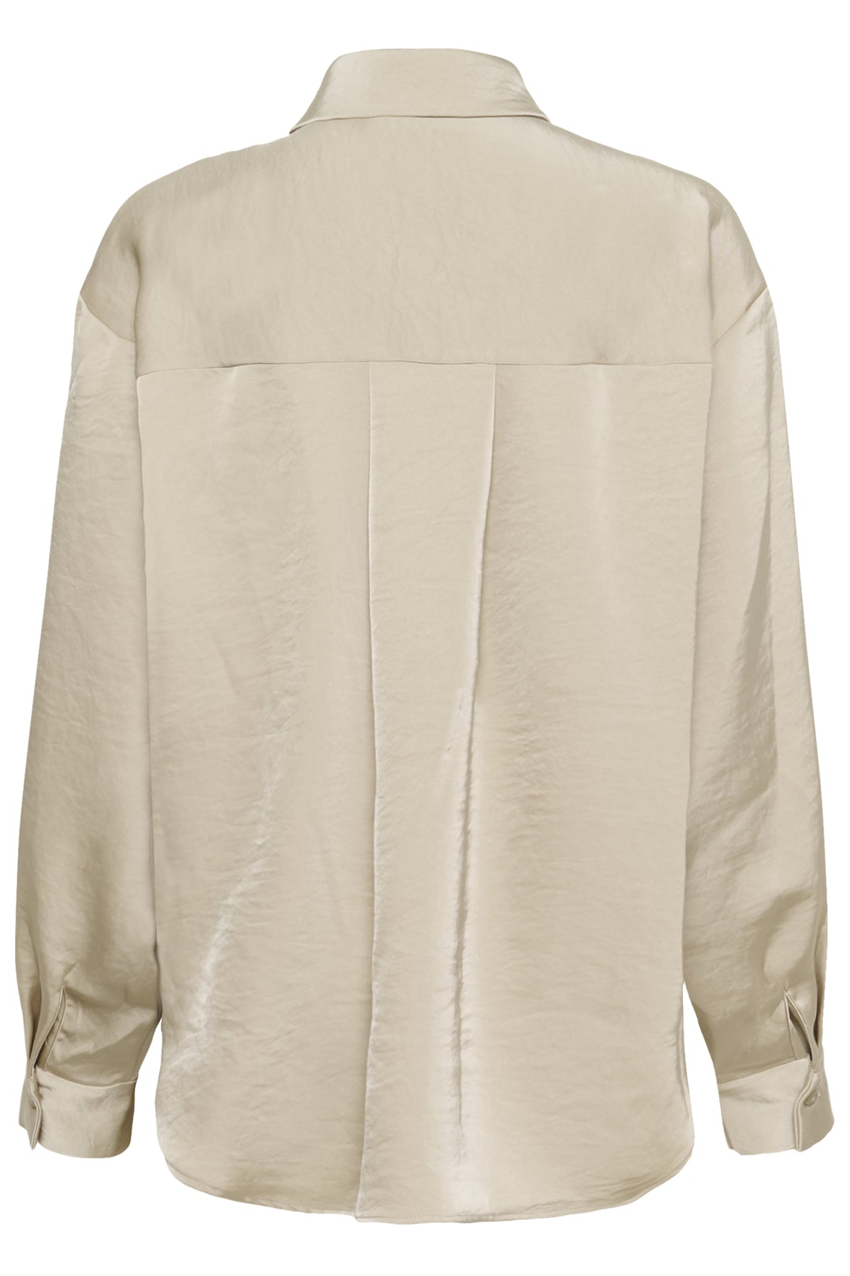 Stor-skjorte med knappestolpe, klassisk krage og helknappet front i shiny look. Lange ermer, avslappet passform, legg i ryggen og buet fald gir stilsikker edge til hverdagen.
