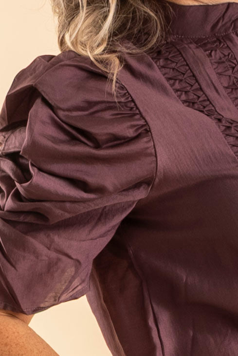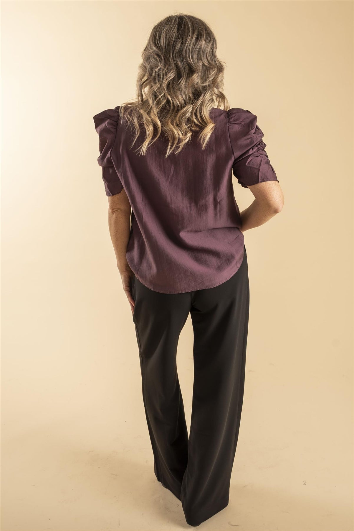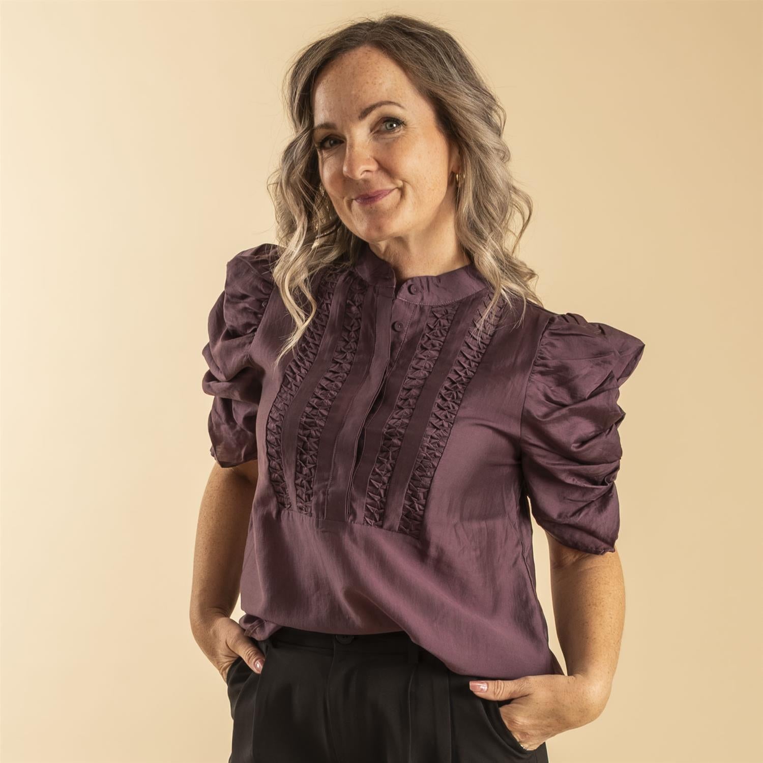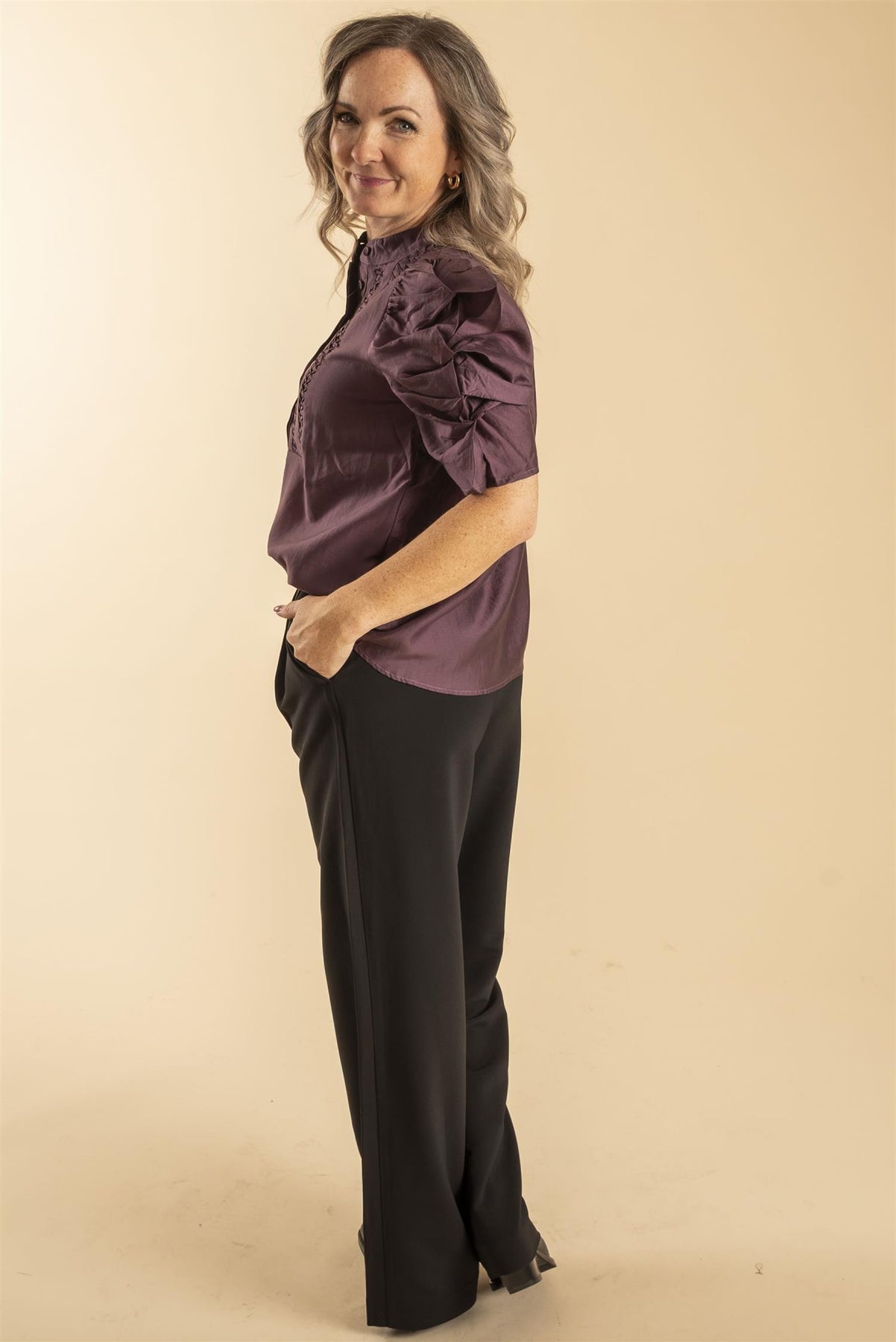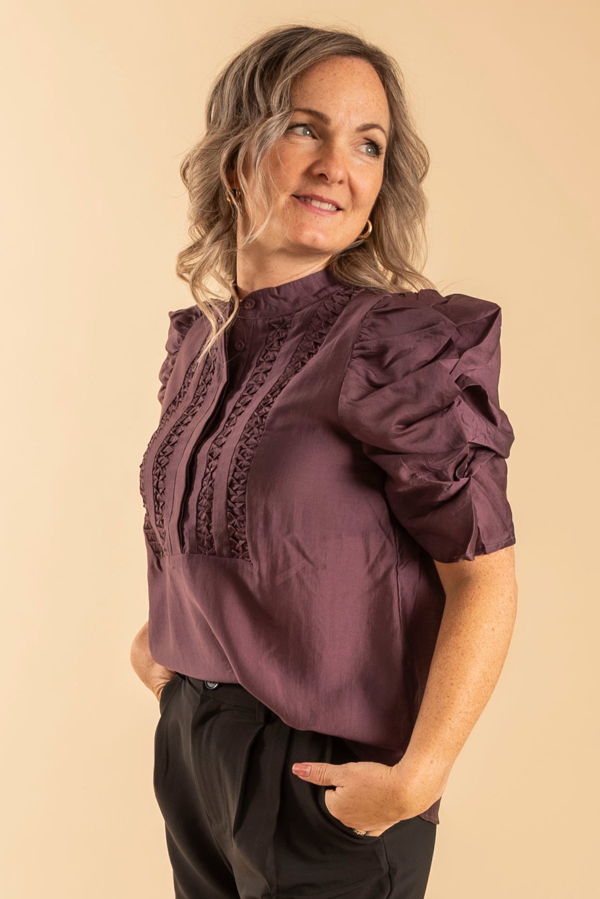 Vakker og spesiell bluse med korte ermer som har en distinkt puffet effekt, som gir en dramatisk og moderne silhuett. Ermene er voluminøse og skaper et stilig utseende. Blusen har en høy hals som lukkes med en knapp foran og en svært dekorativ blomst på den ene siden.
