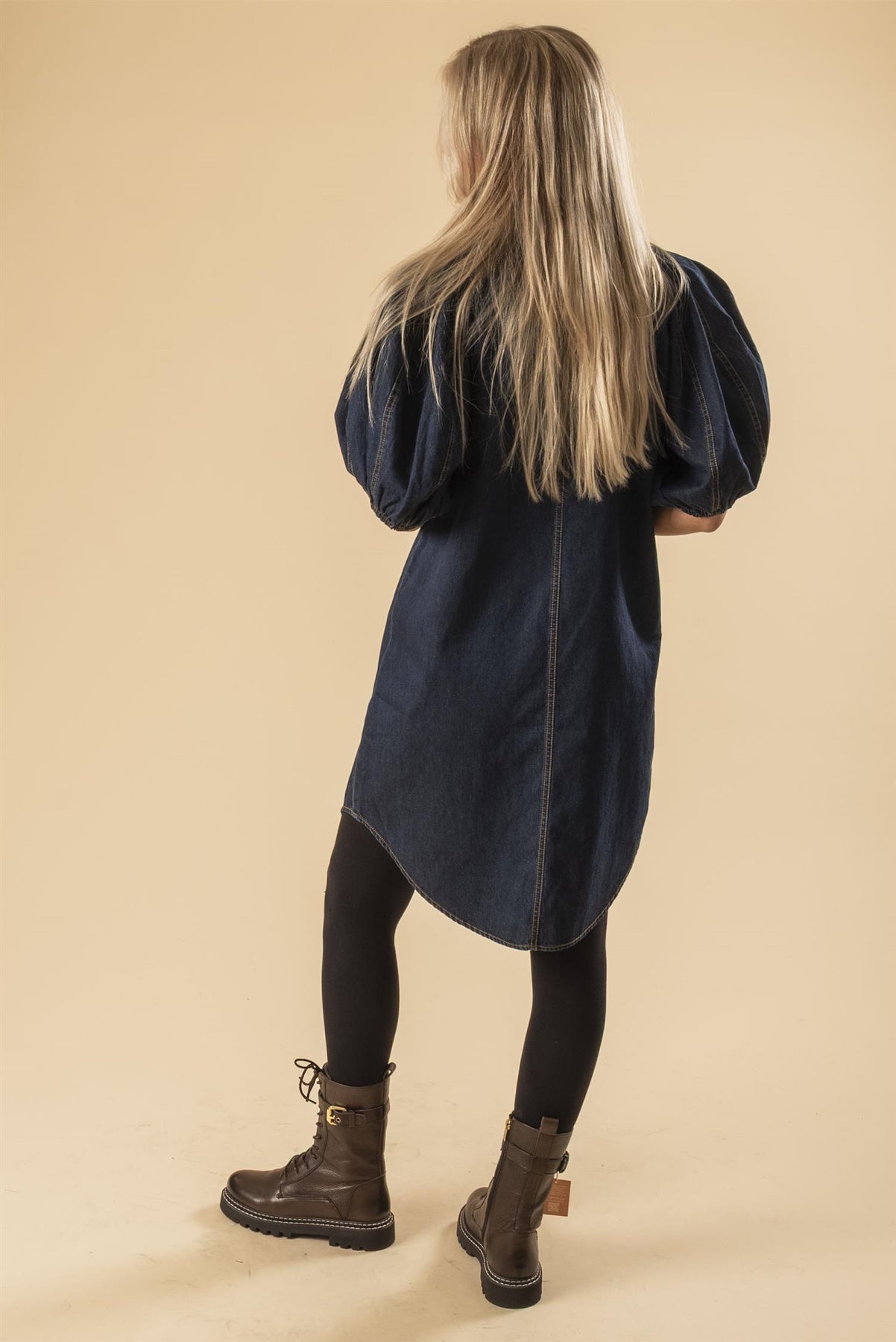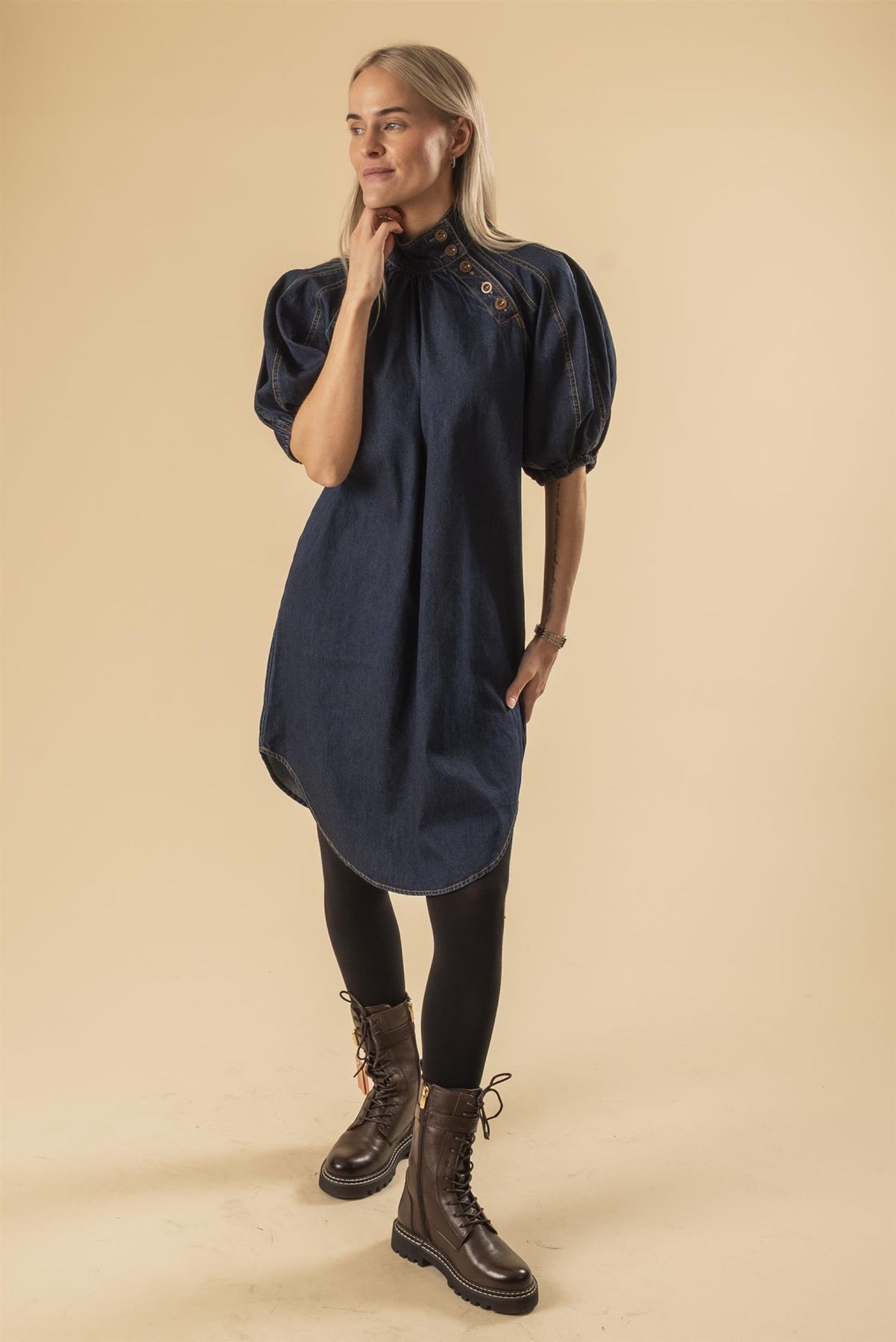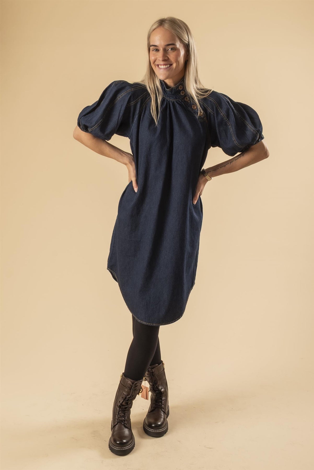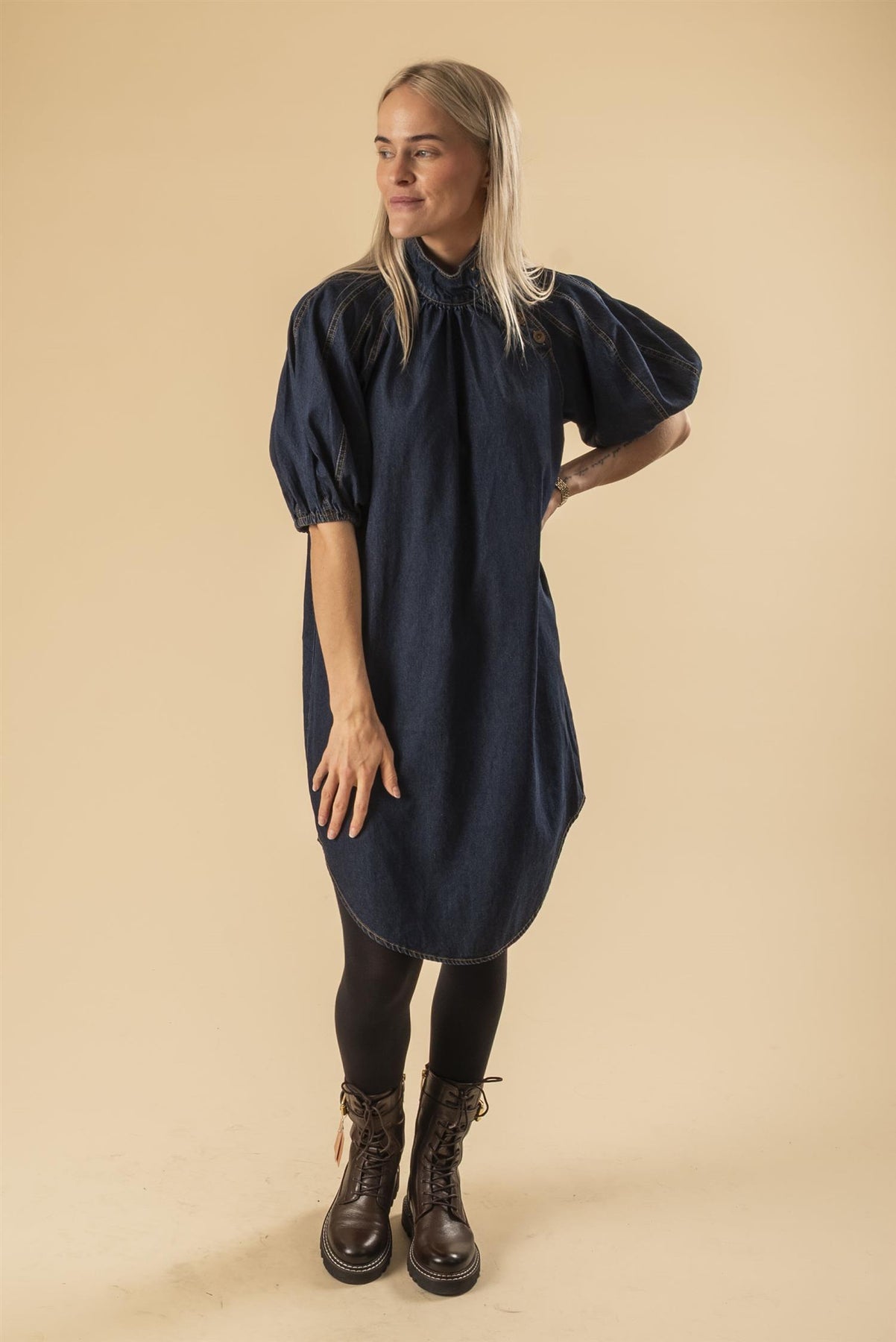 Mørk denimkjole med fine detaljer i mørk denim, perfekt for høsten.