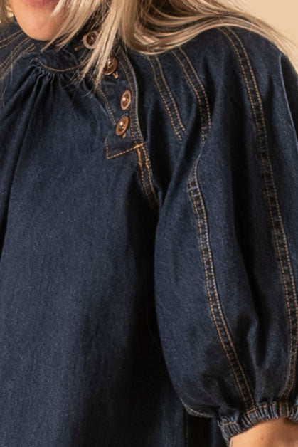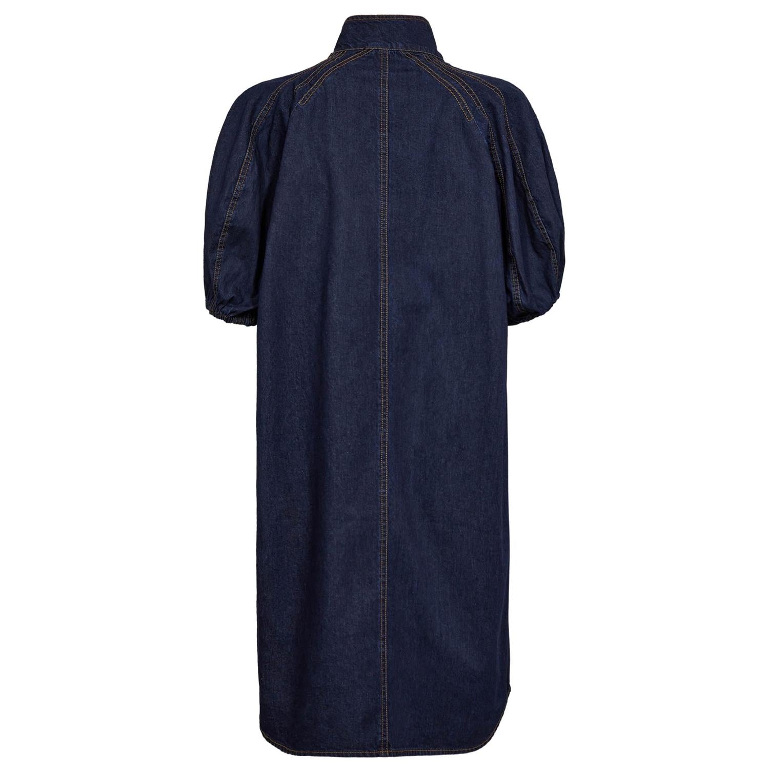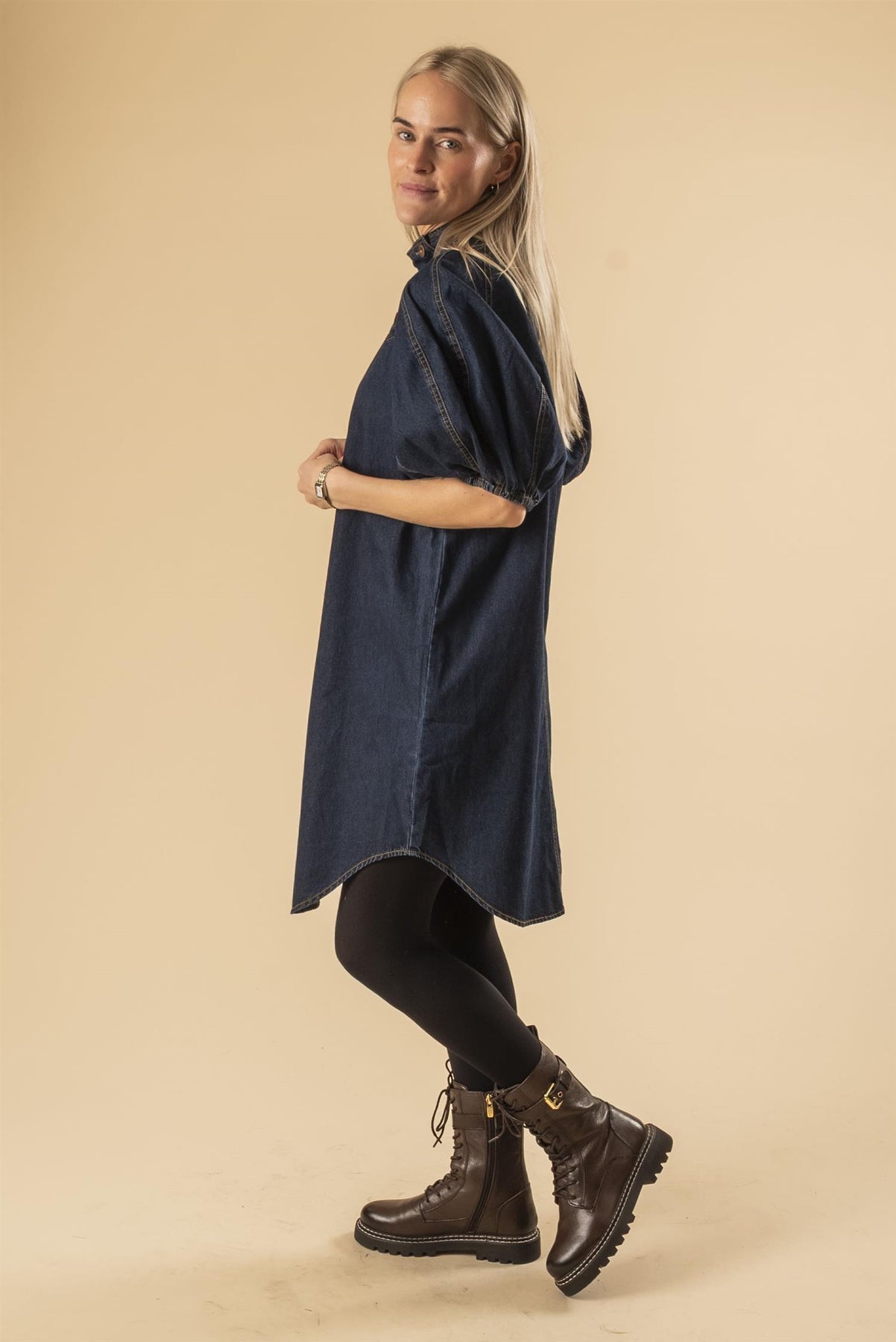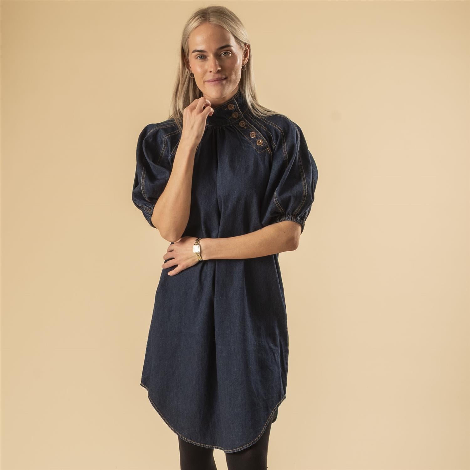 Mørk denimkjole med fine detaljer i mørk denim, perfekt for høsten.