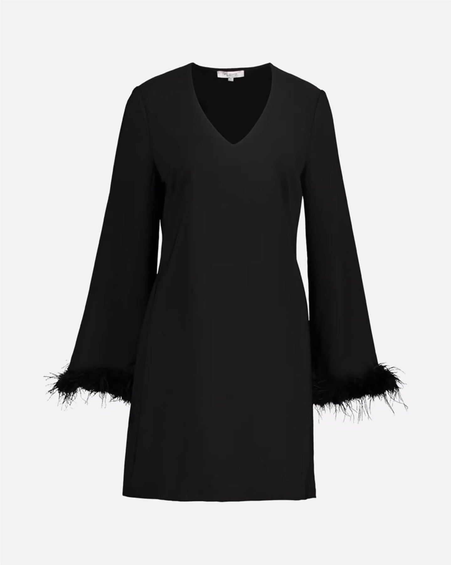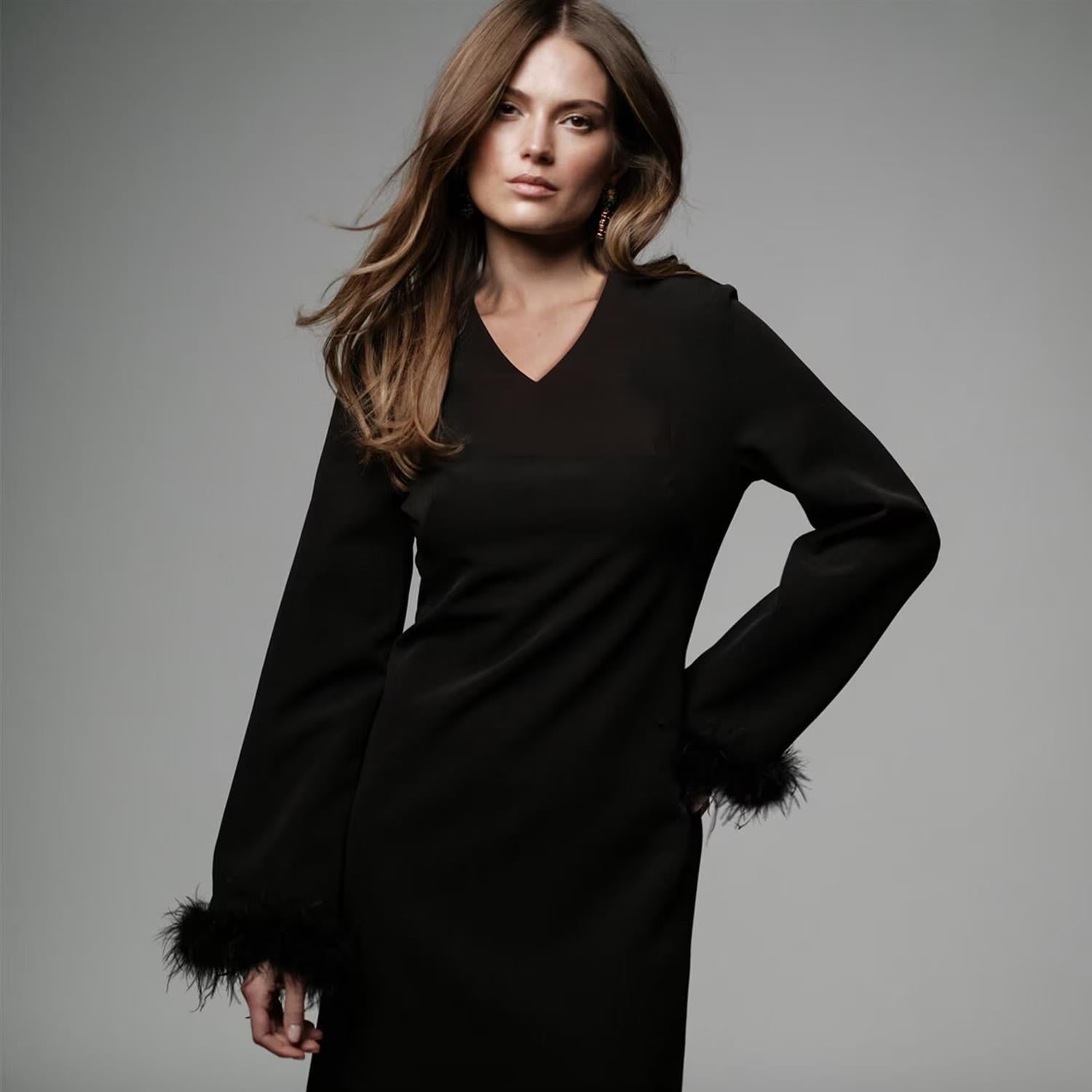 Superkul sort kjole, med en ekstra dose attitude! Denne elegante kjolen kombinerer et tidløst snitt med lekne detaljer som gjør den perfekt til både fest og spesielle anledninger. Med sin flatterende V-hals og rette passform får du en stilren silhuett, mens de lange ermene med fjærkant gir et luksuriøst og trendy preg som garantert trekker blikkene til seg.