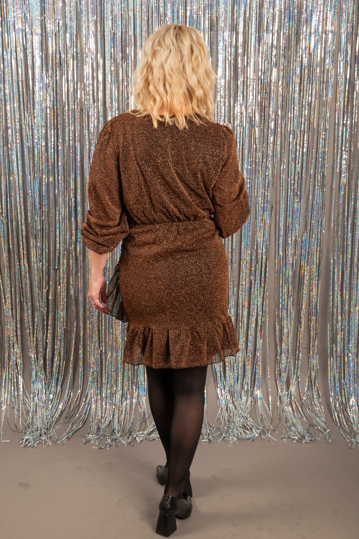 Lekker kjole med metalliske tråder som gir den et glitrende utseende. Den perfekte festkjolen til deg som ønsker en klassisk look med det lille ekstra!