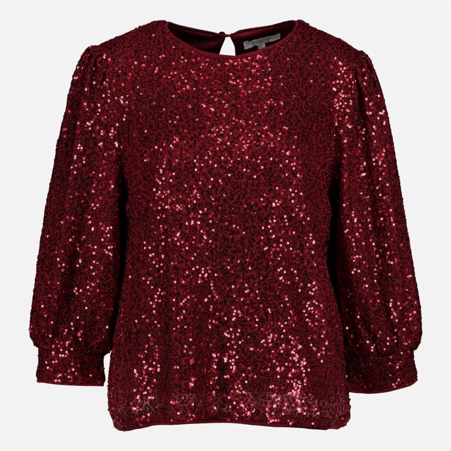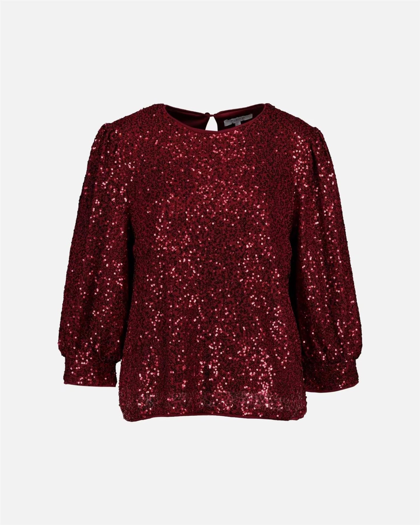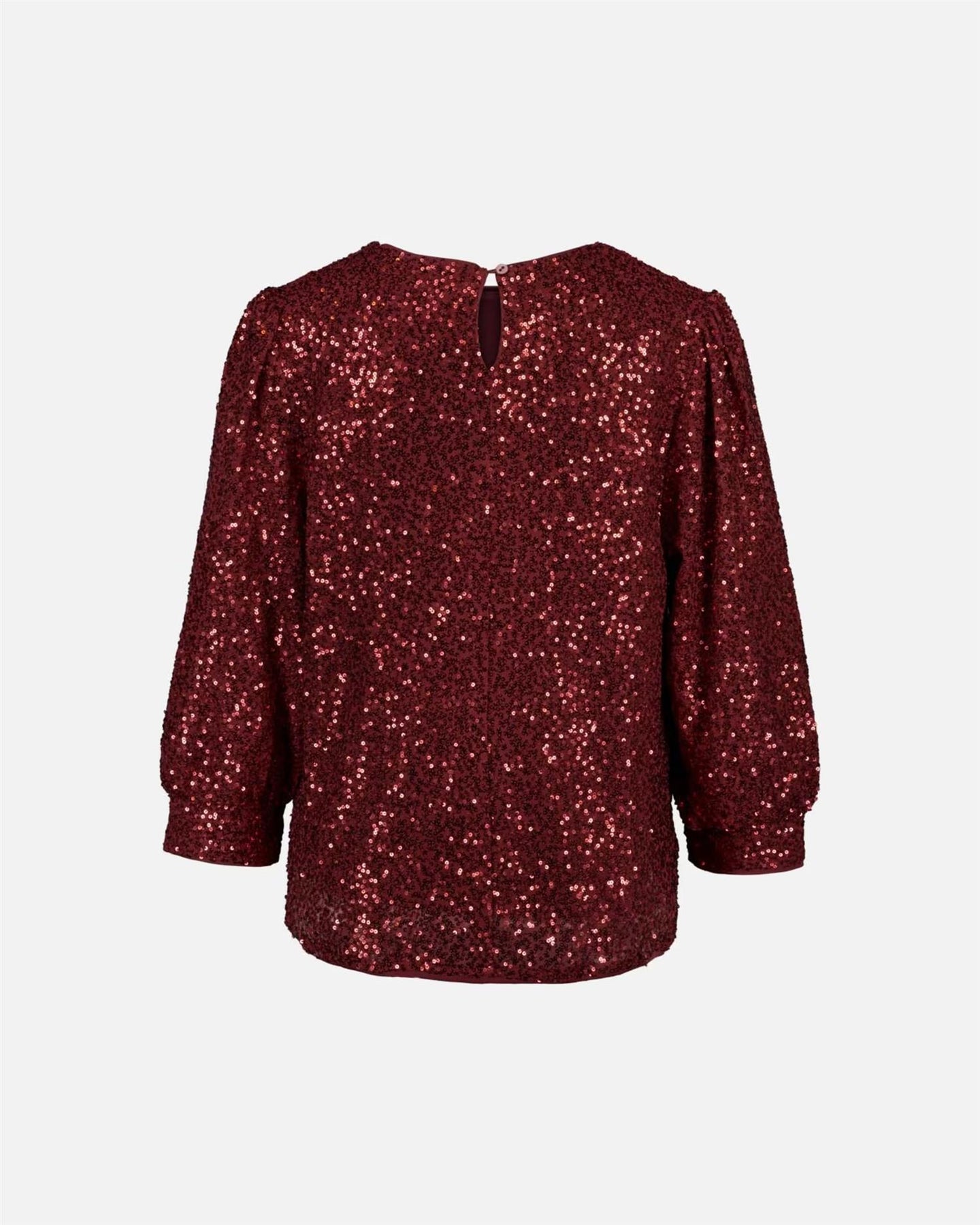 Ps. Denne toppen har bordeux farget paljetter. Bilde av modell for å vise passform.
