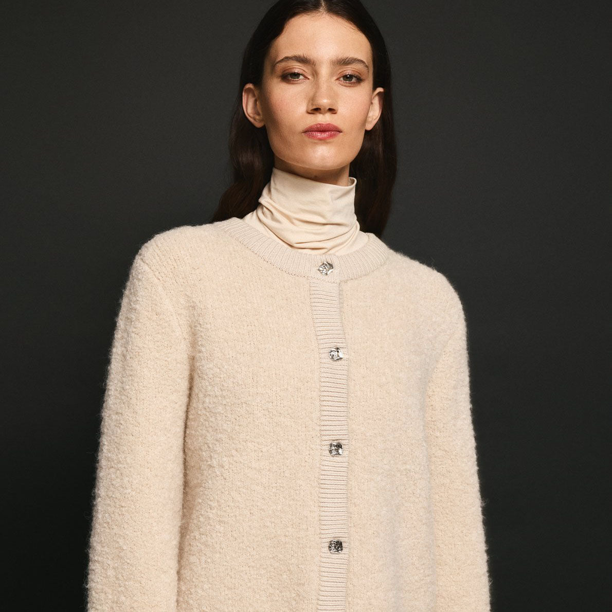 Denne cardigan har en boxy passform, med ribbkant som står i kontrast til cardiganens uldne ytre. Cardiganen har et 2 lags strikk, så den er allminneligt strikket på innsiden.
