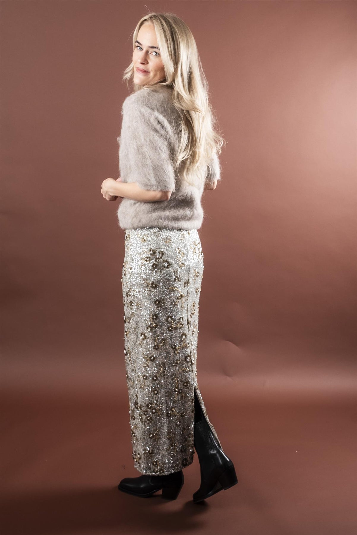 Et statementskjørt som fanger lyset og setter stemningen for fest. Magnolia Skirt har en rett, midi snitt dekorert med skinnende paljetter og blomsterbroderi som gir en luksuriøs finish. Kombiner det med en enkel topp for en balansert look, eller gå all in med paljetter for en glamorøs kveld.