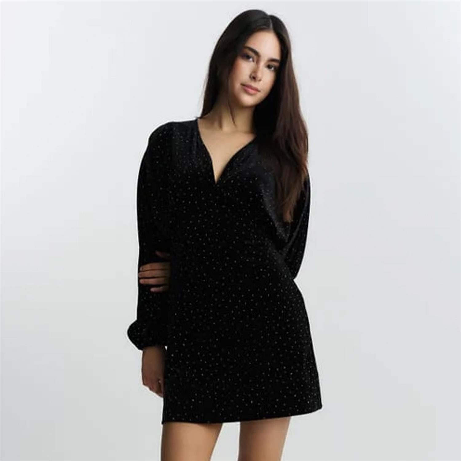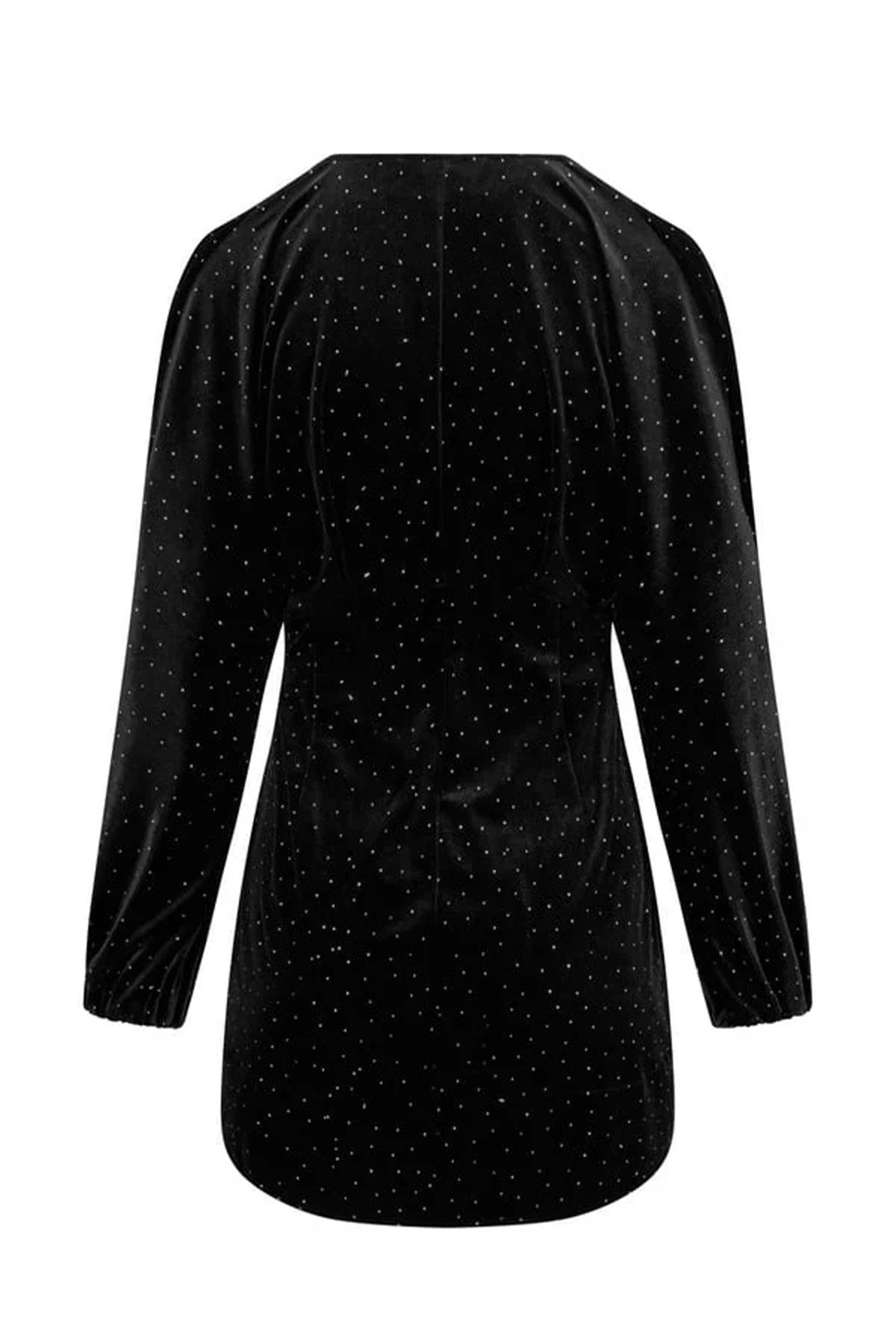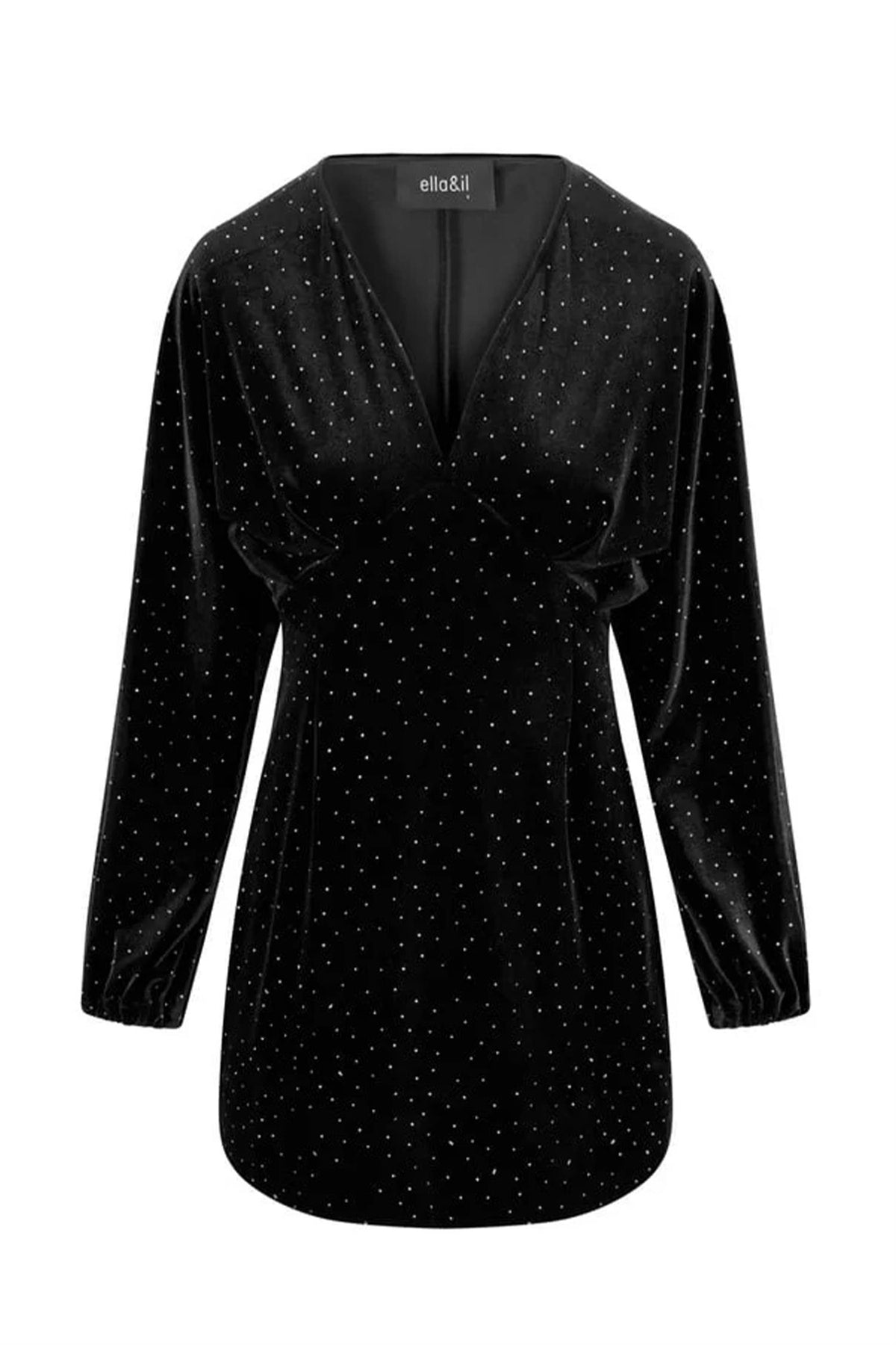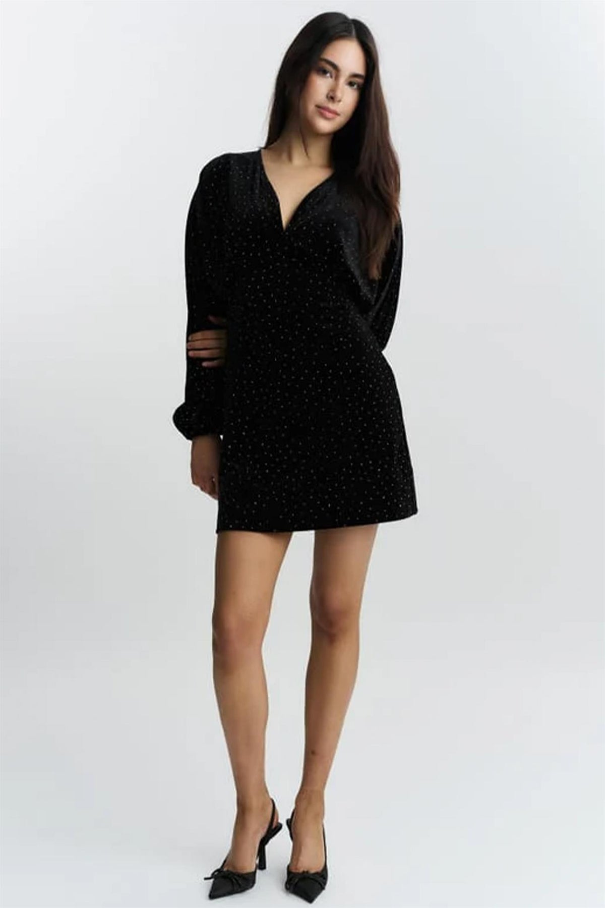 Nydelig kjole i sort velur. Philo Dress kommer i en feminin passform med lange ermer med noe puff, v-hals og en lengde til låret. Dekorert med små glitrende studs gjennomgående over kjolen som sammen med den myke veluren gjør dette til en perfekt kjole til festsesongen vi går i møte. Kombiner med et par øredobber og et par øredobber for en tidløs festlook.
