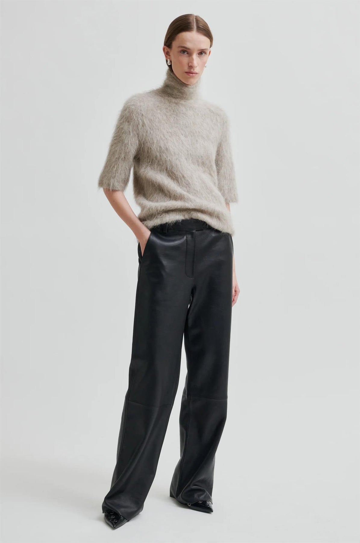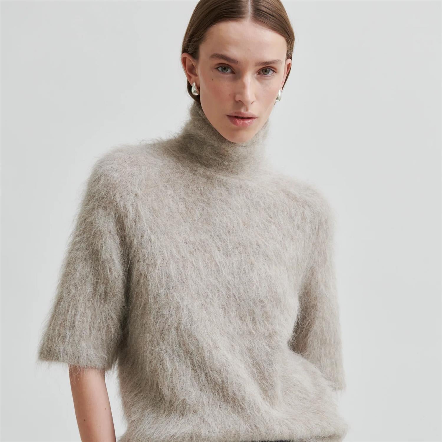 Herlig myk og luksuriøs strikk med en moderne vri. Genseren har korte ermer og høy hals som gir et sofistikert uttrykk, mens den fluffy overflaten tilfører et eksklusivt preg. Den rette passformen gjør plagget enkelt å style både til bukser og skjørt, og den er like fin til hverdags som til mer pyntede anledninger.