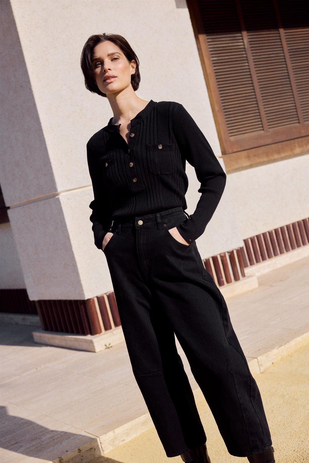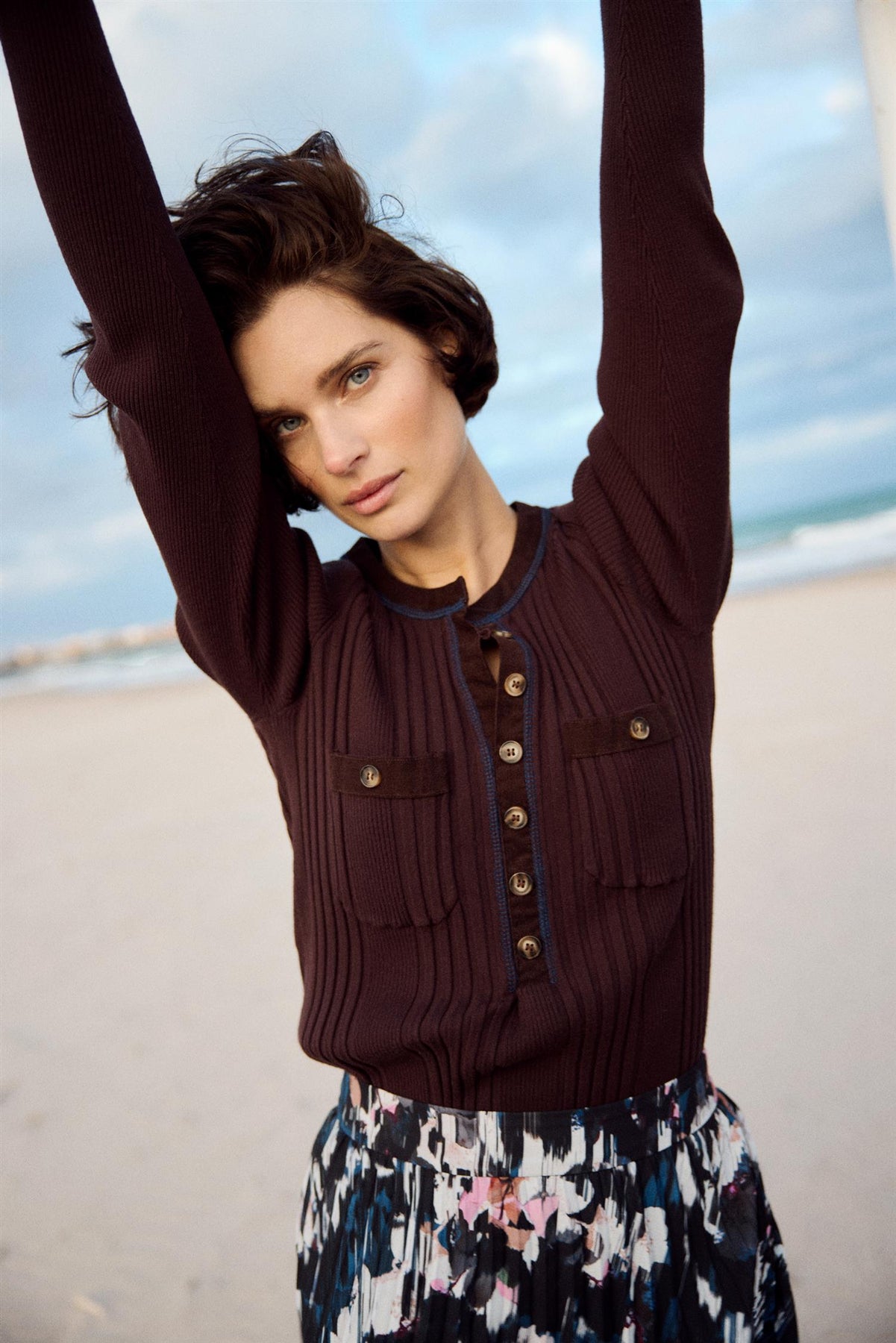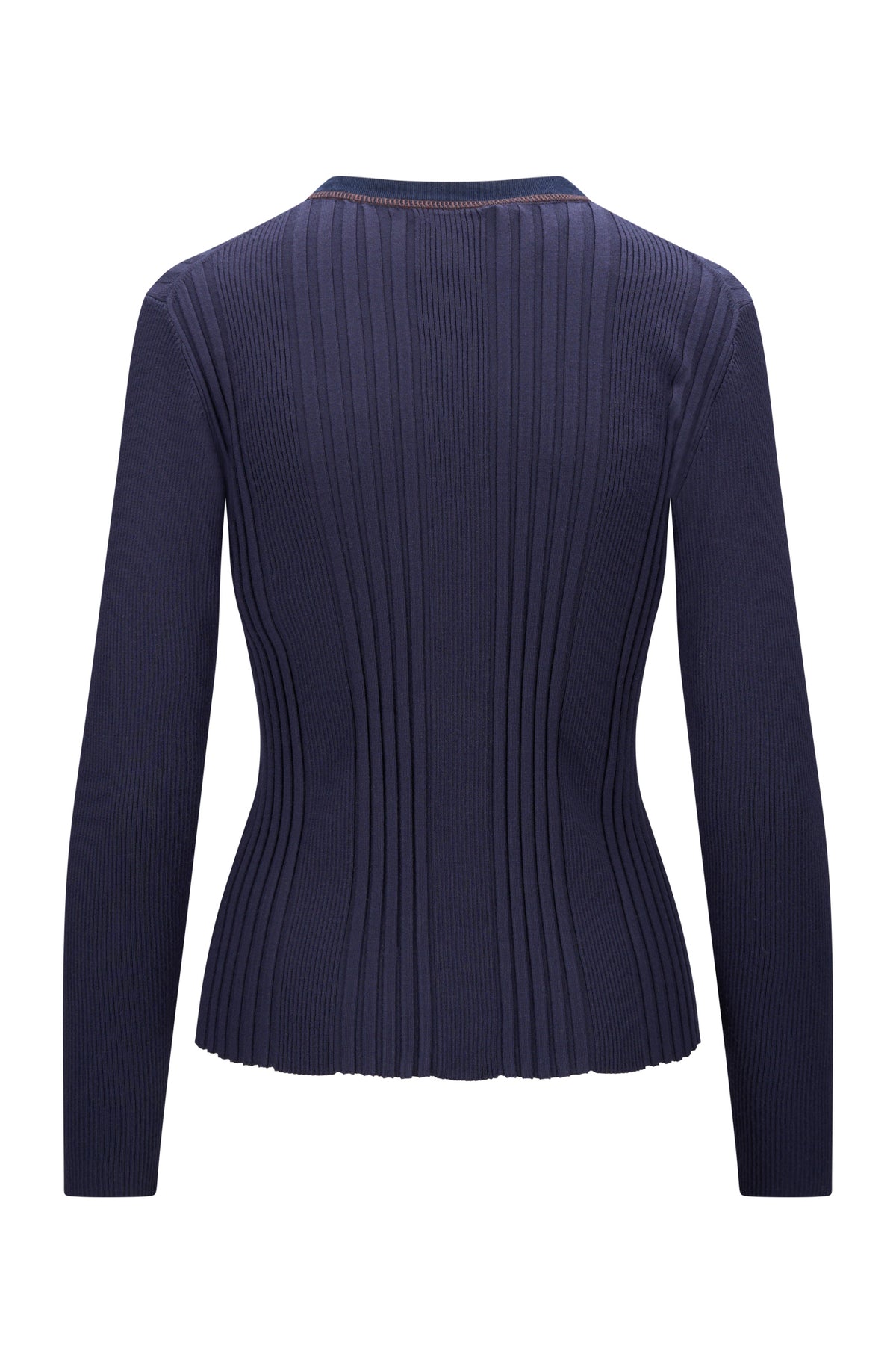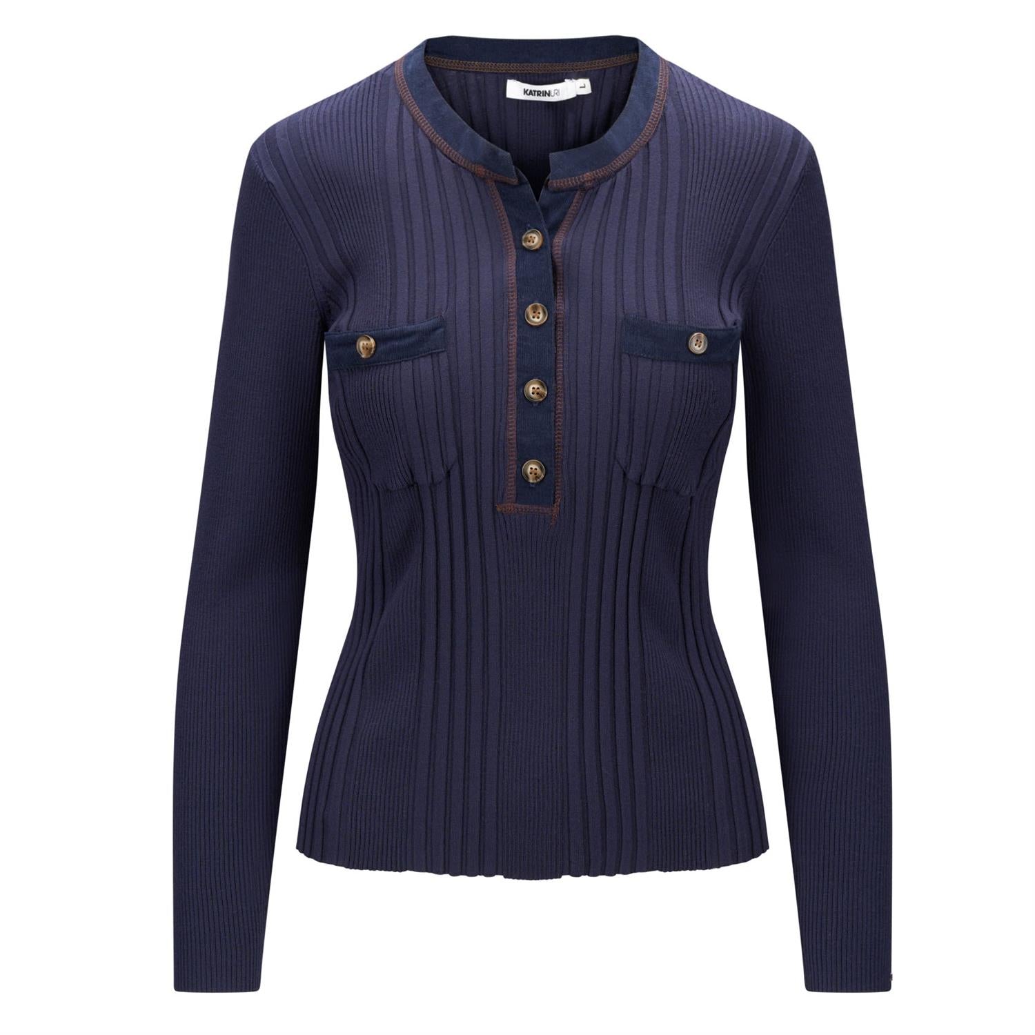 Lekker langermet strikket topp med krage og knepping i front. Toppen er ribbestrikket, kantet med myk cord og har dekorative ton-i-ton-knapper samt 2 frontlommer.
