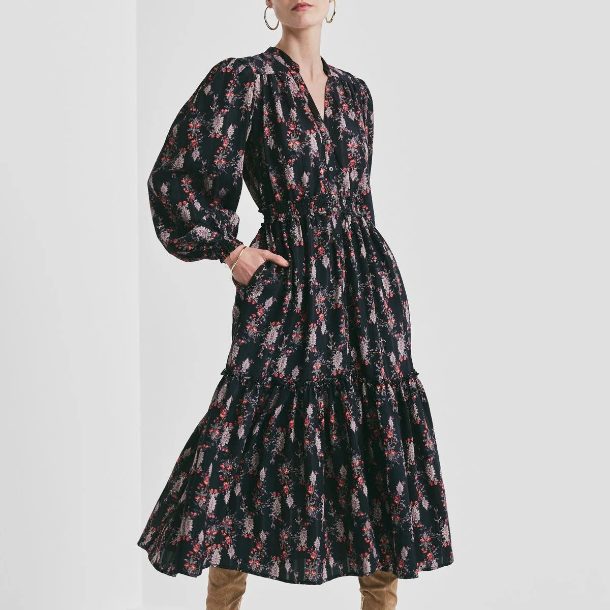 Vakker kjole i midilengde med avslappet silhuett, elastisk midje, V-hals, knapper foran og puffermer med elastiske mansjetter. Kjolen har belteringer og leveres med matchende knytebånd.