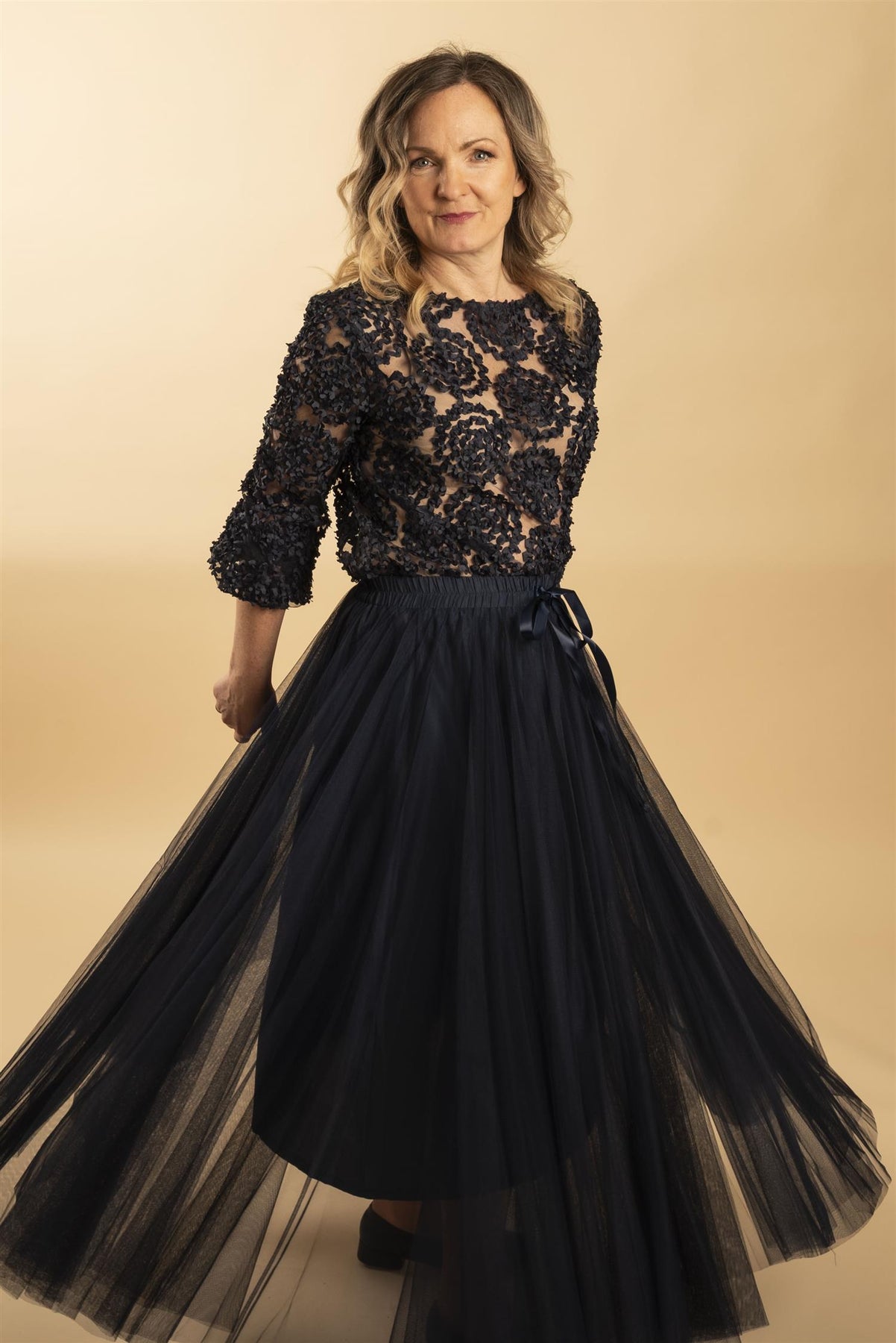 Et drømmende tyllskjørt som tilfører et feminint og romantisk uttrykk til garderoben. Skjørtet består av flere lag med lett og luftig tyll, noe som gir en vakker, svevende effekt. Den elastiske midjen sikrer komfort og en fleksibel passform, perfekt både til festlige anledninger og en sofistikert hverdagslook.