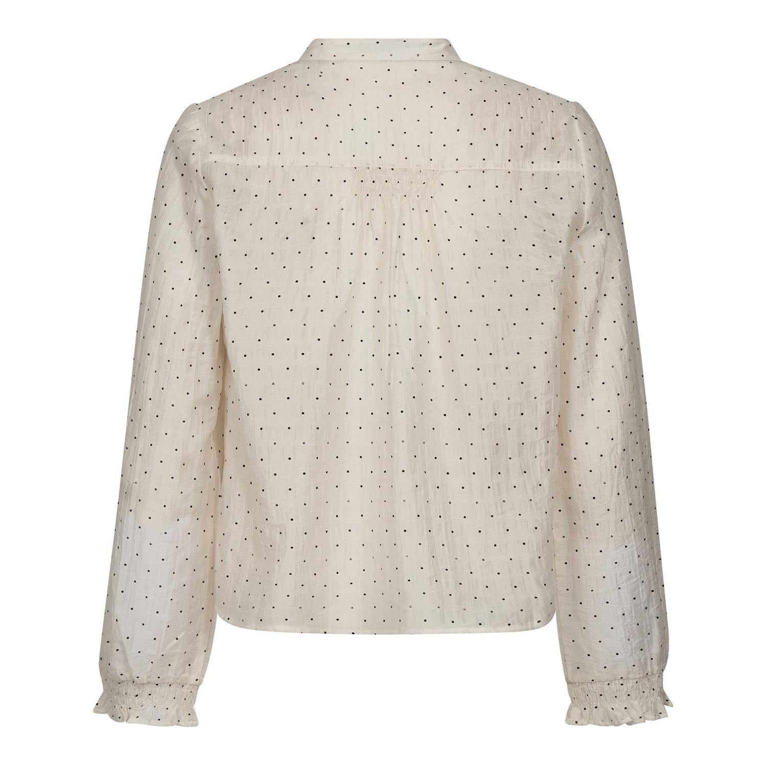 Trendy bluse i offwhite med små svarte prikker er en feminin og elegant bluse med et lett og moderne uttrykk. V-utringningen med knappelukking gir en flatterende silhuett, mens de lange ermene med rynkede mansjetter tilfører myk struktur. Det polkaprikkede mønsteret gir et lekent, men samtidig tidløst preg som passer både til hverdags og mer pyntede anledninger.