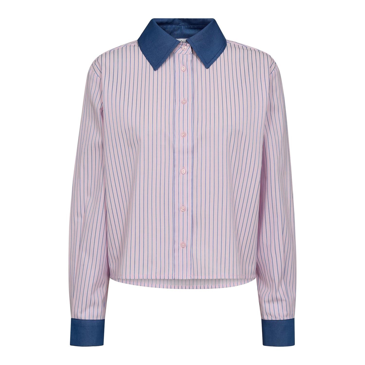 Stripete skjorte i rosa med mørkeblå og blå vertikale striper. Skjorten har en kontrastfarget blå krage og mansjetter.