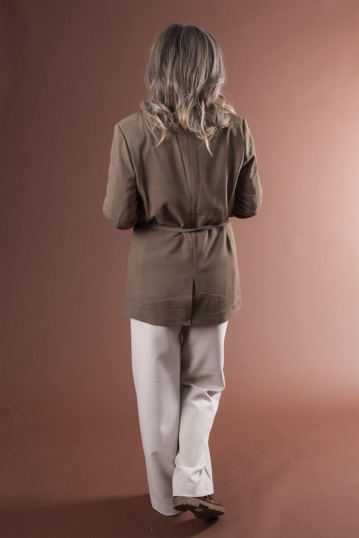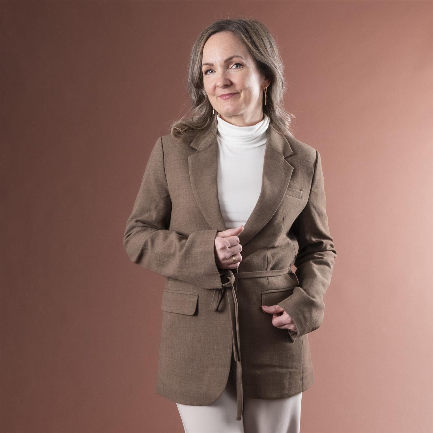 Skreddersydd blazer i vevd stoff med diskret tekstur. Lukkes med én knapp, trendy knytebelte i midjen og passpolerte lommer foran.