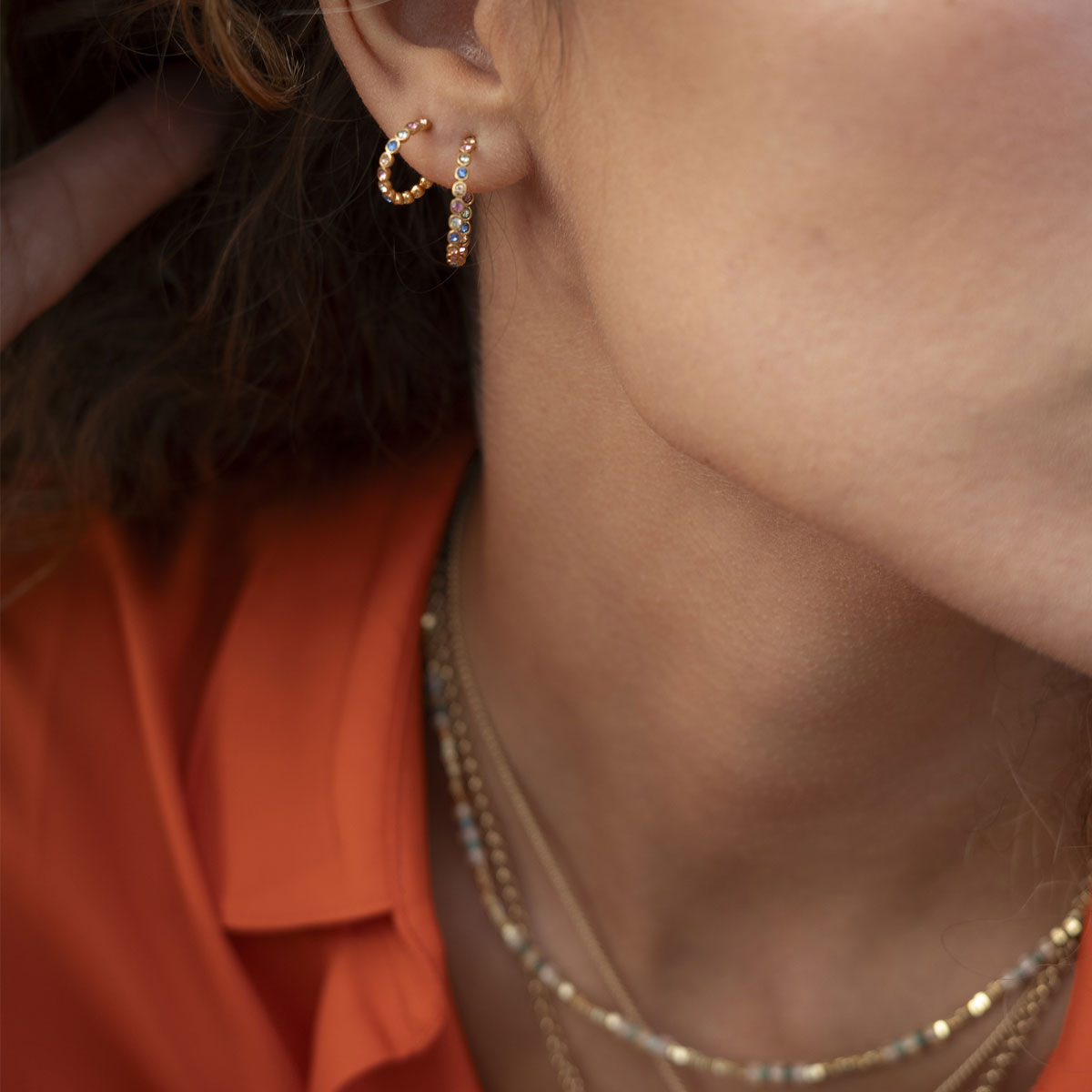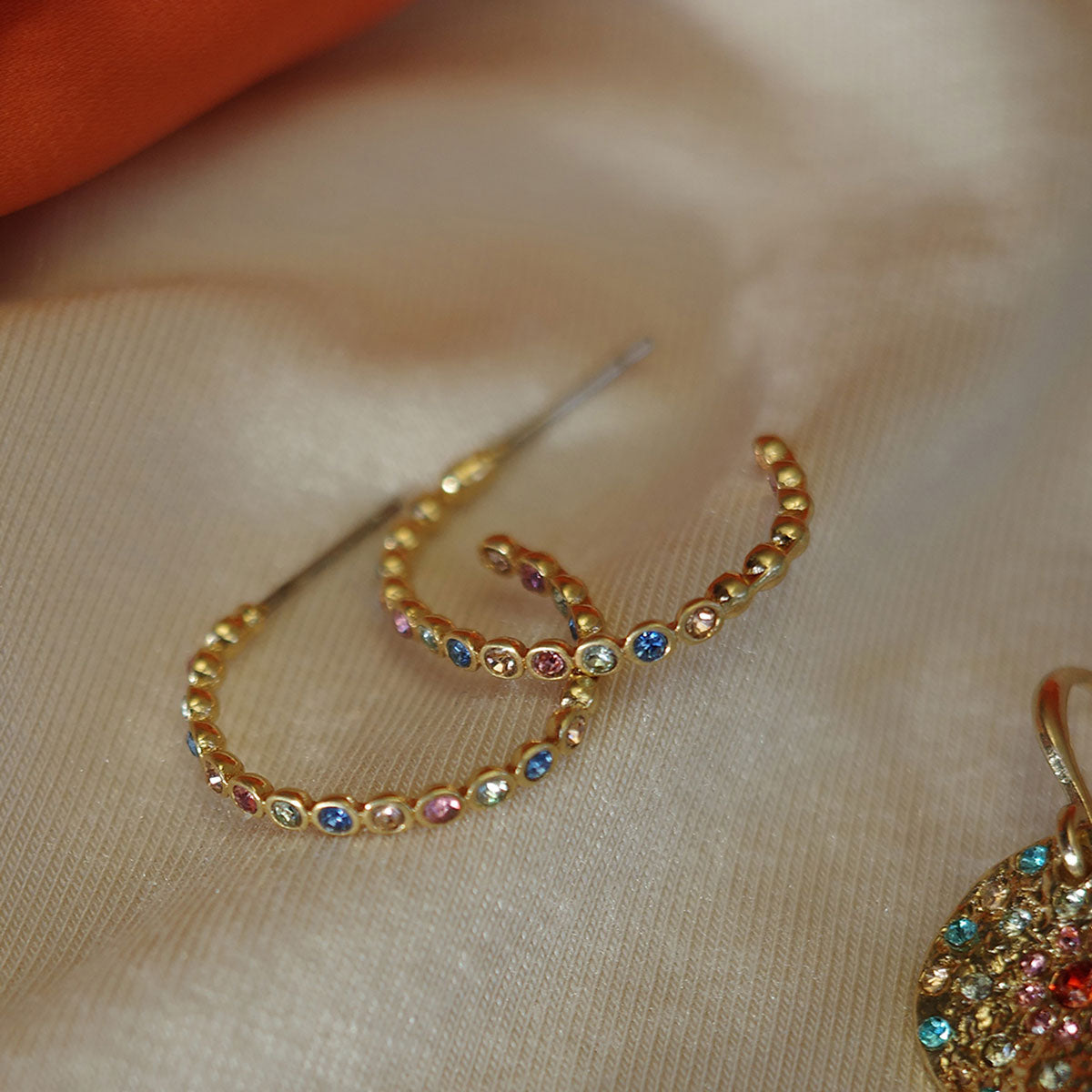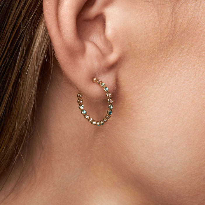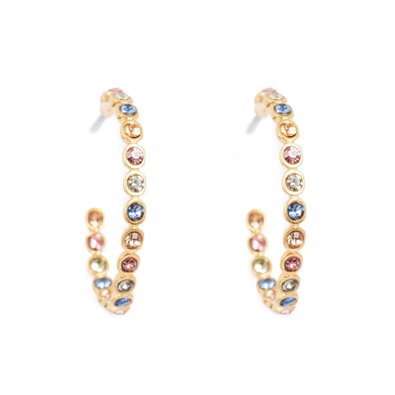 Delikate tynne øreringer med glitrende steiner i ulike farger. Legg merke til stenene på innsiden av kreolen! Øreringene inngår i kolleksjonen Vibrance, som er en nydelig, fargerik kolleksjon som løfter ethvert antrekk. Smykkene består av teksturerte mynter dekorert med glitrende, fargerike steiner.