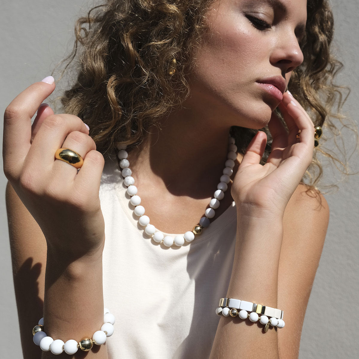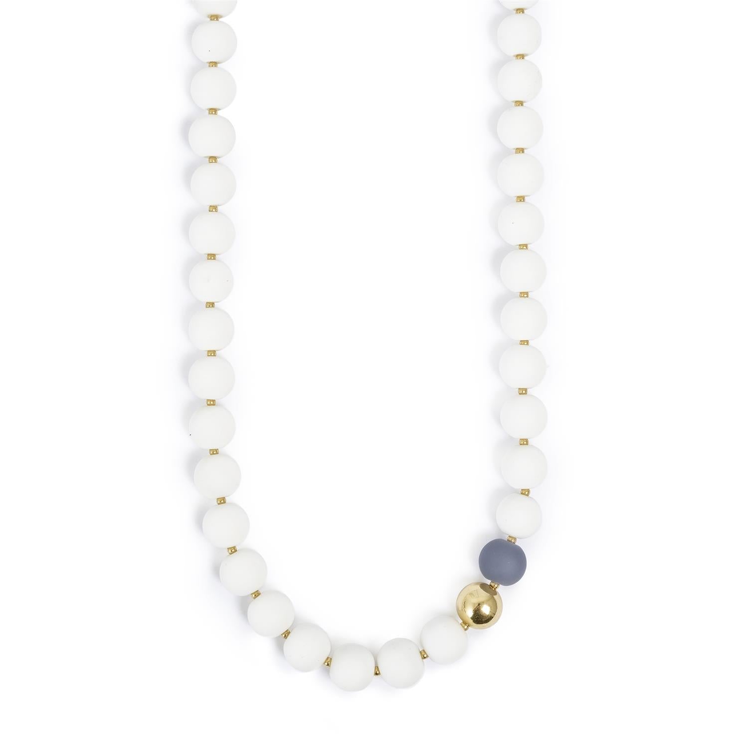 Trendy kjede med store kuler! Til det vårlige antrekket kan det brukes på utsiden av genseren - men det er også superlekkert til bar hud! White Dreams er en stilren kolleksjon basert på rene former og subtile detaljer. Ulike hvittoner, innslag av grått og glitrende krystaller, danner en harmonisk helhet. Kontrastene mellom matte og blanke overflater i gull tilfører det lille ekstra. Like fine alene som lag på lag.