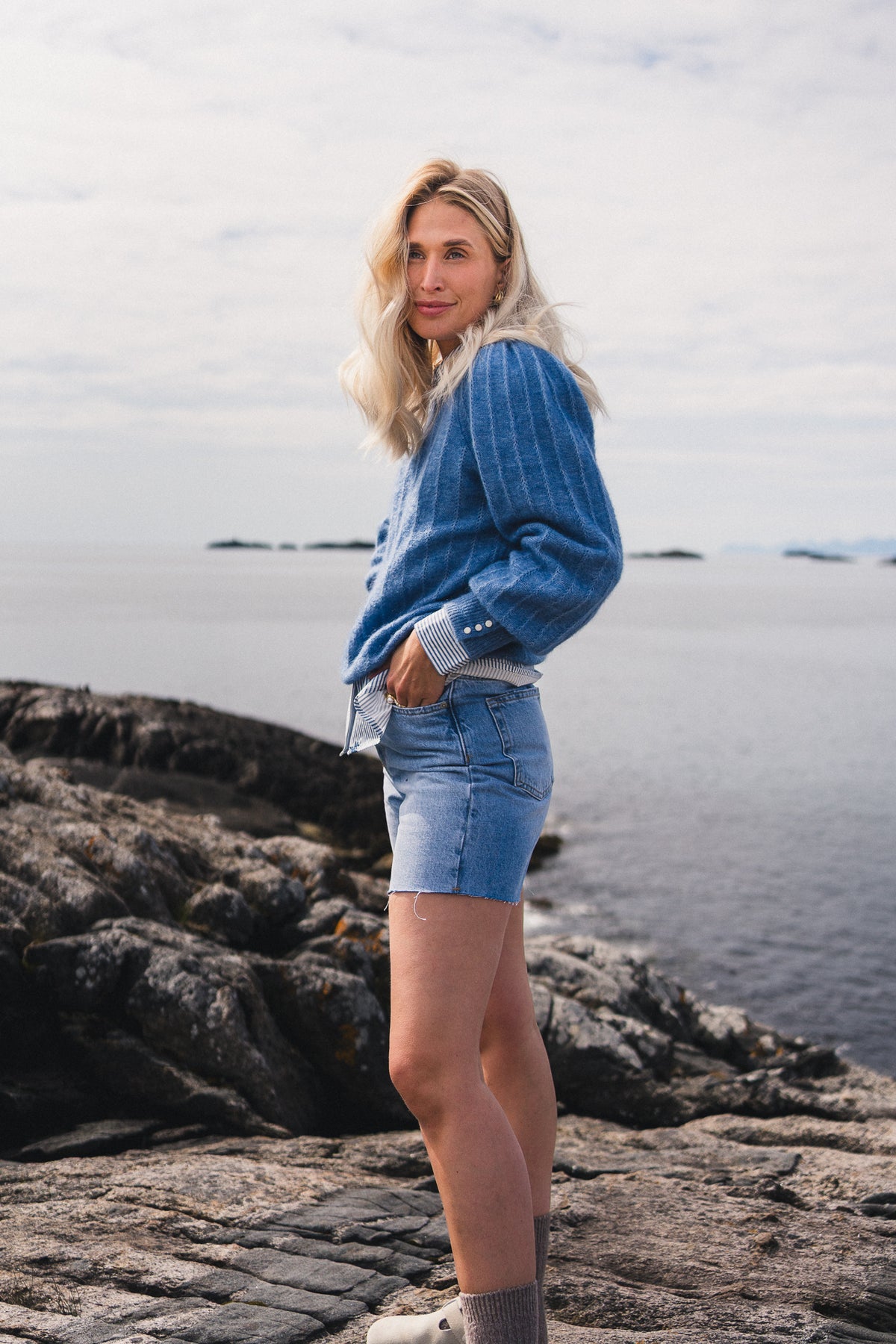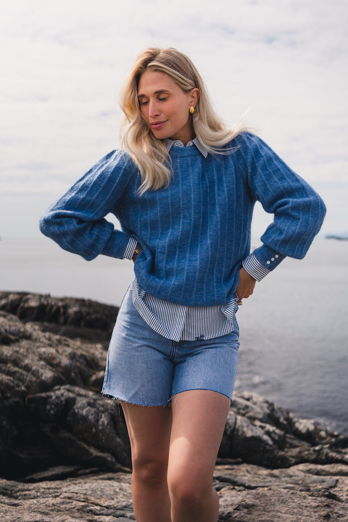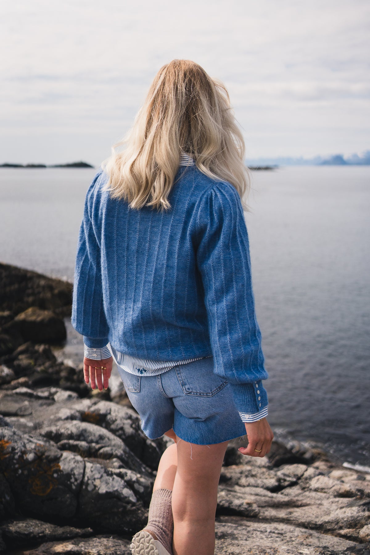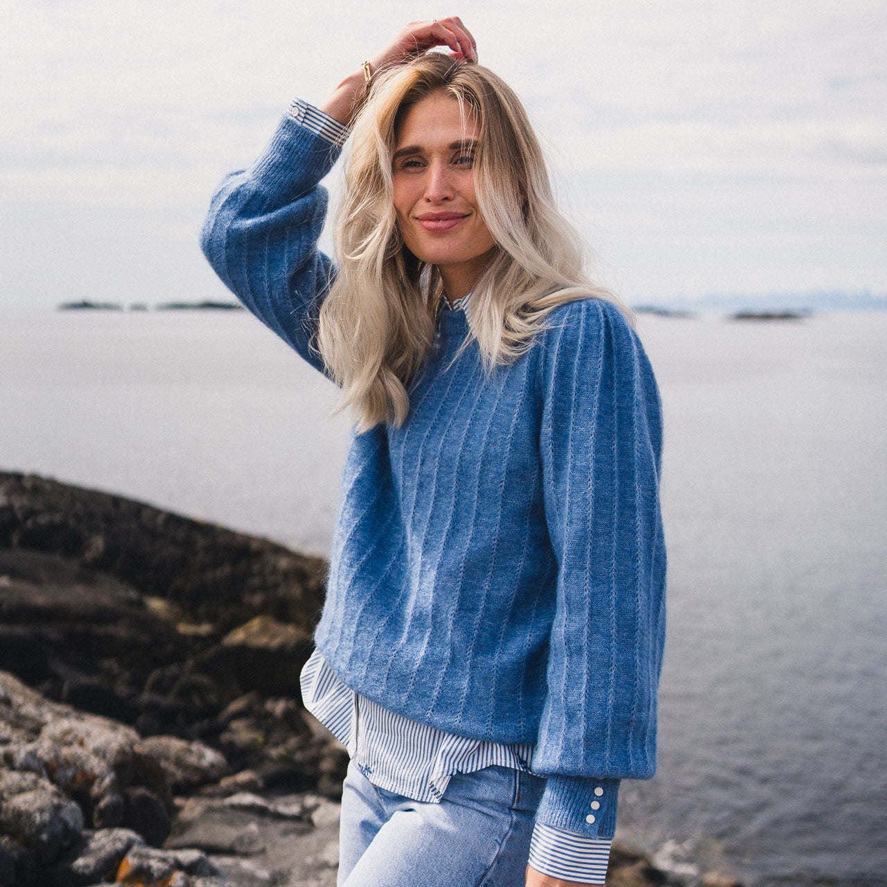 En nydelig strikk, og et must-have plagg i garderoben! Den har feminine detaljer og kommer i en vakker blåfarge som gir et friskt og elegant uttrykk. Genseren er strikket i en myk ullblanding med ribb-kanter og et delikat mønster som gir den et unikt uttrykk.