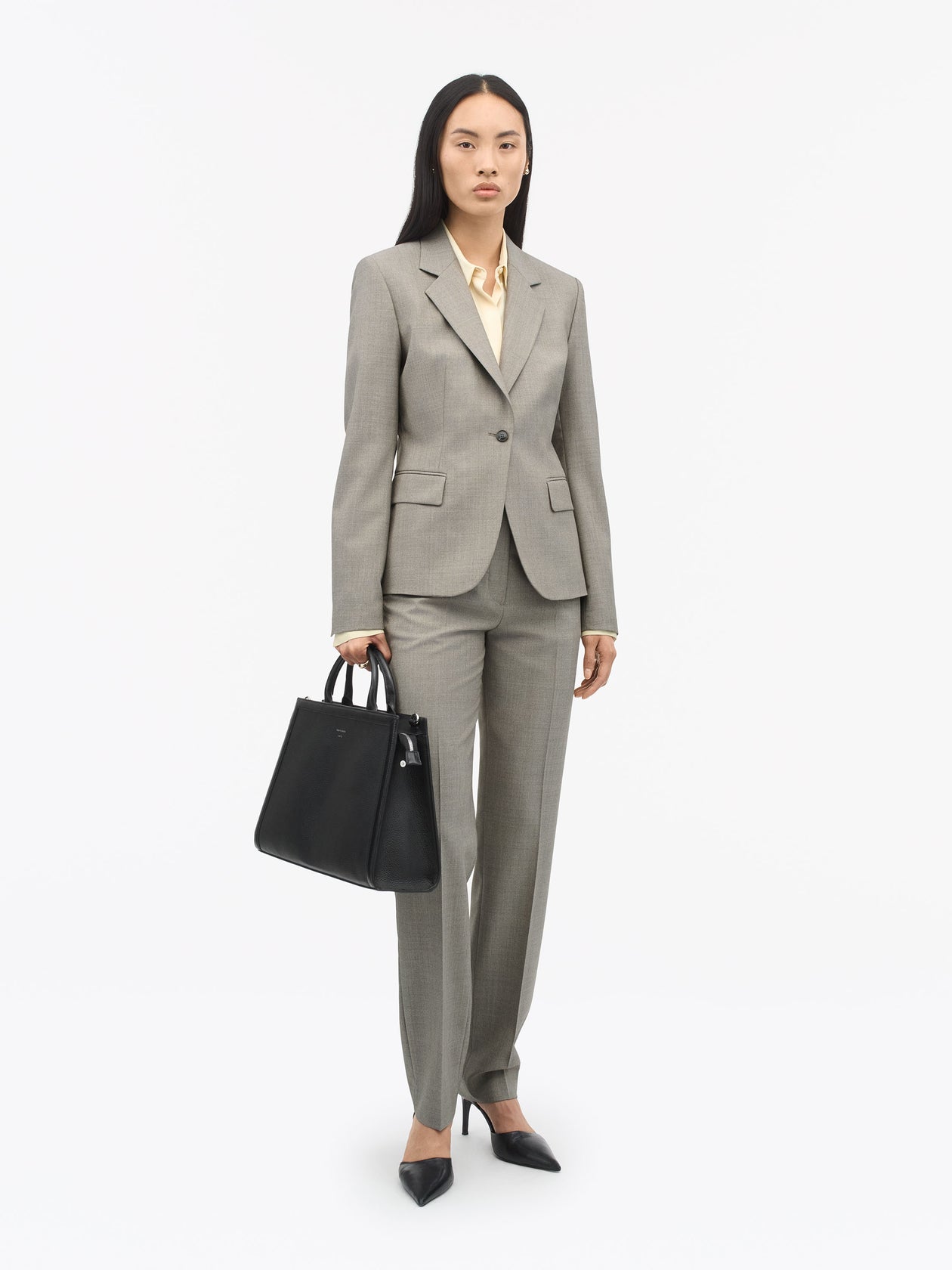 Den kombinerer mykt, kornet skinn med glatte, blanke skinndetaljer for en sofistikert finish.