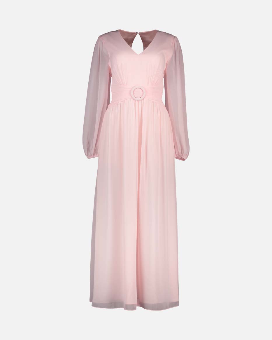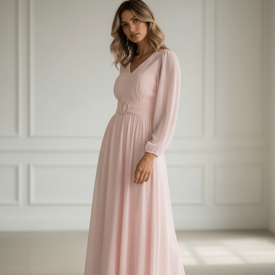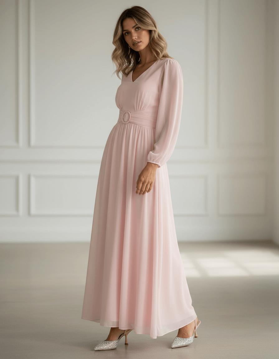 En elegant og sofistikert selskapskjole med et luftig og feminint uttrykk. Kjolen har flatterende v-hals og lange, lette ermer med lett volum og elastisk mansjett. Ermene er ufôrede og lett transparente, noe som gir et delikat og svevende preg. Den markerte midjen fremheves av en dekorativ beltedetalj foran, mens smock bak gir en fleksibel og komfortabel passform. Åpen ryggdetalj med knappelukking i nakken setter prikken over i-en.