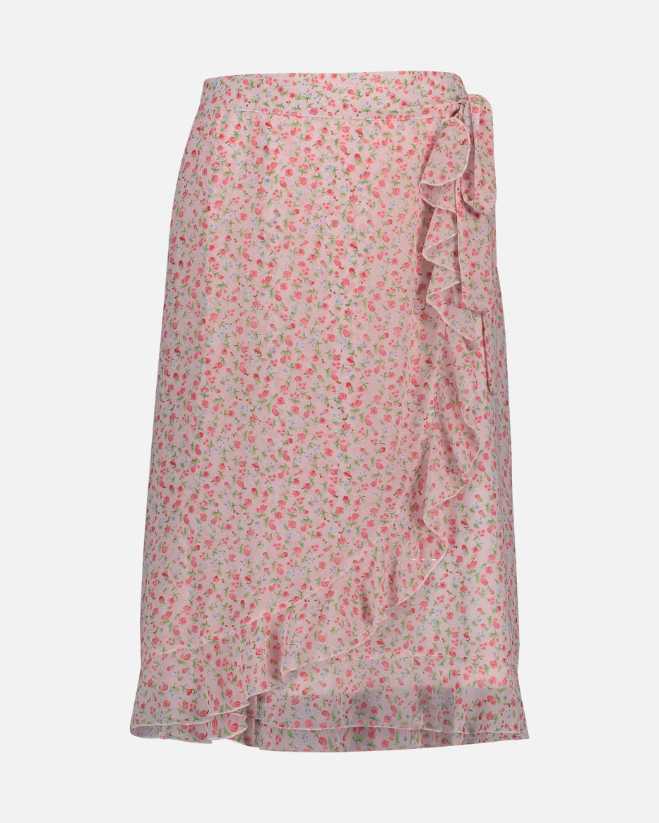 Knelangt og krøllfritt skjørt i chiffon med feminine volanger langs kanten. Strikk i livet, kun på baksiden.