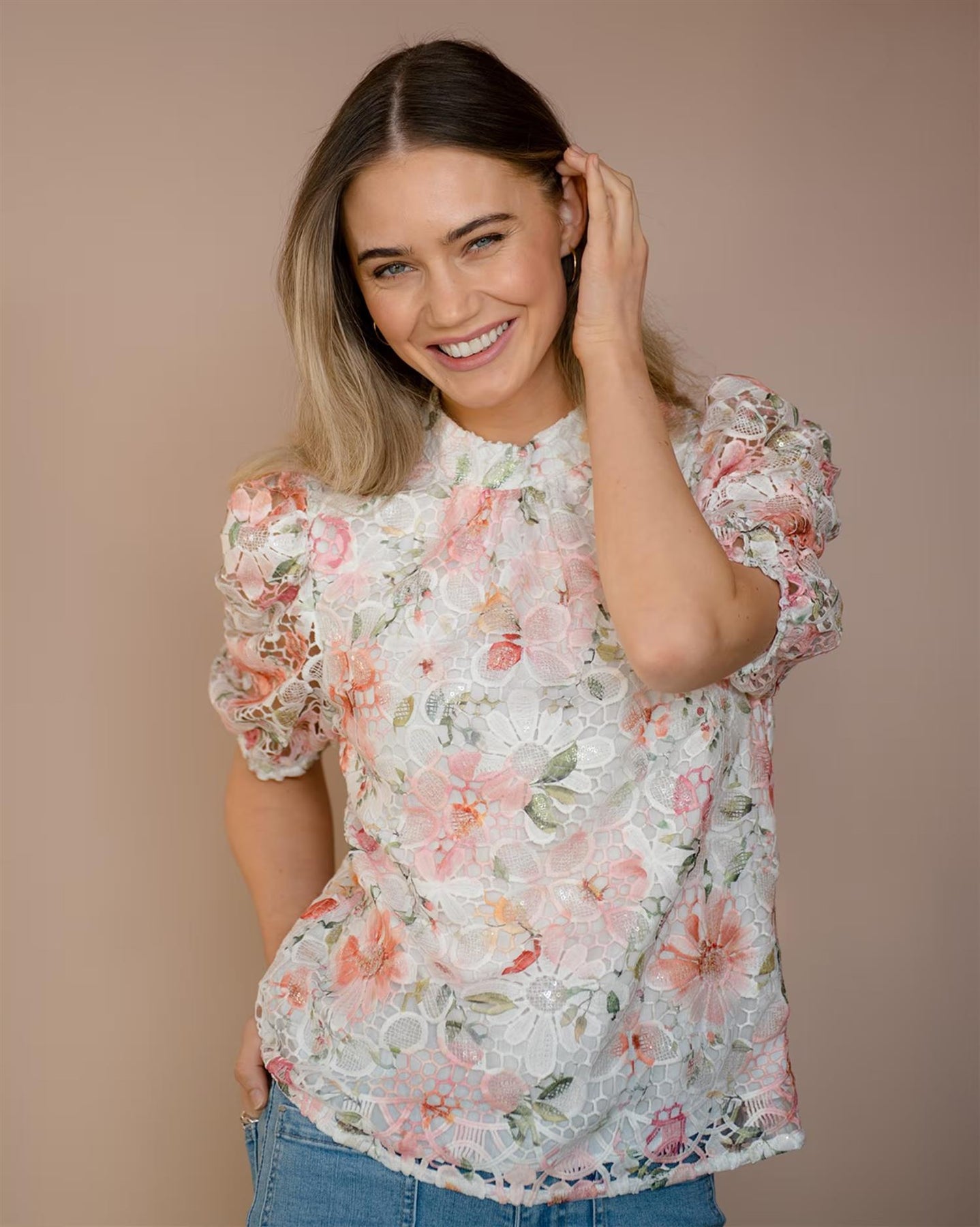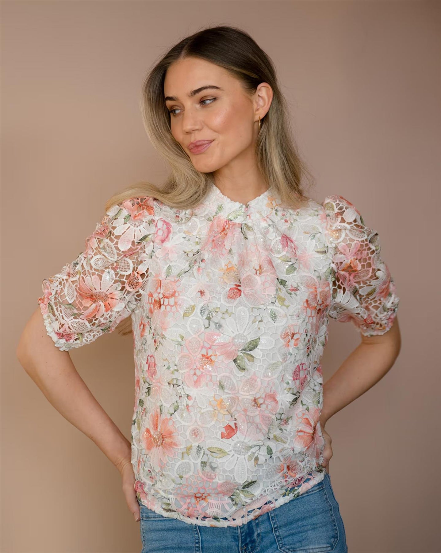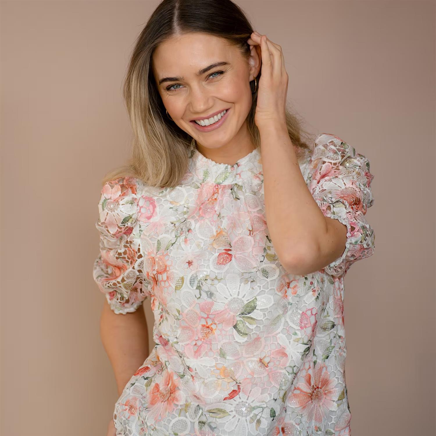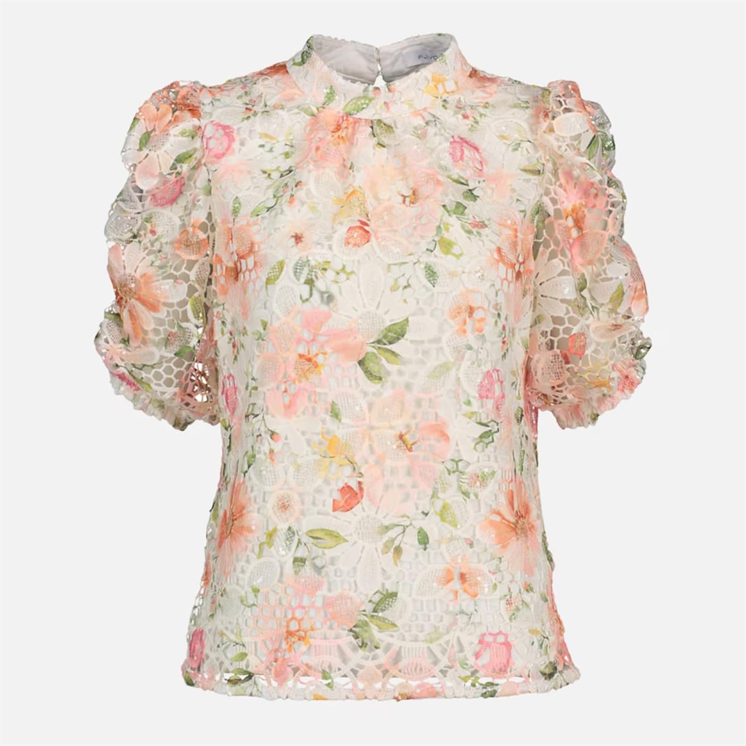 Romantiske bluse i et delikat blomsterprint med vakker blonde som gir et lett og feminint uttrykk. De korte puffer­ermene skaper mykt volum, mens den runde halsen gir en ren og elegant silhuett.