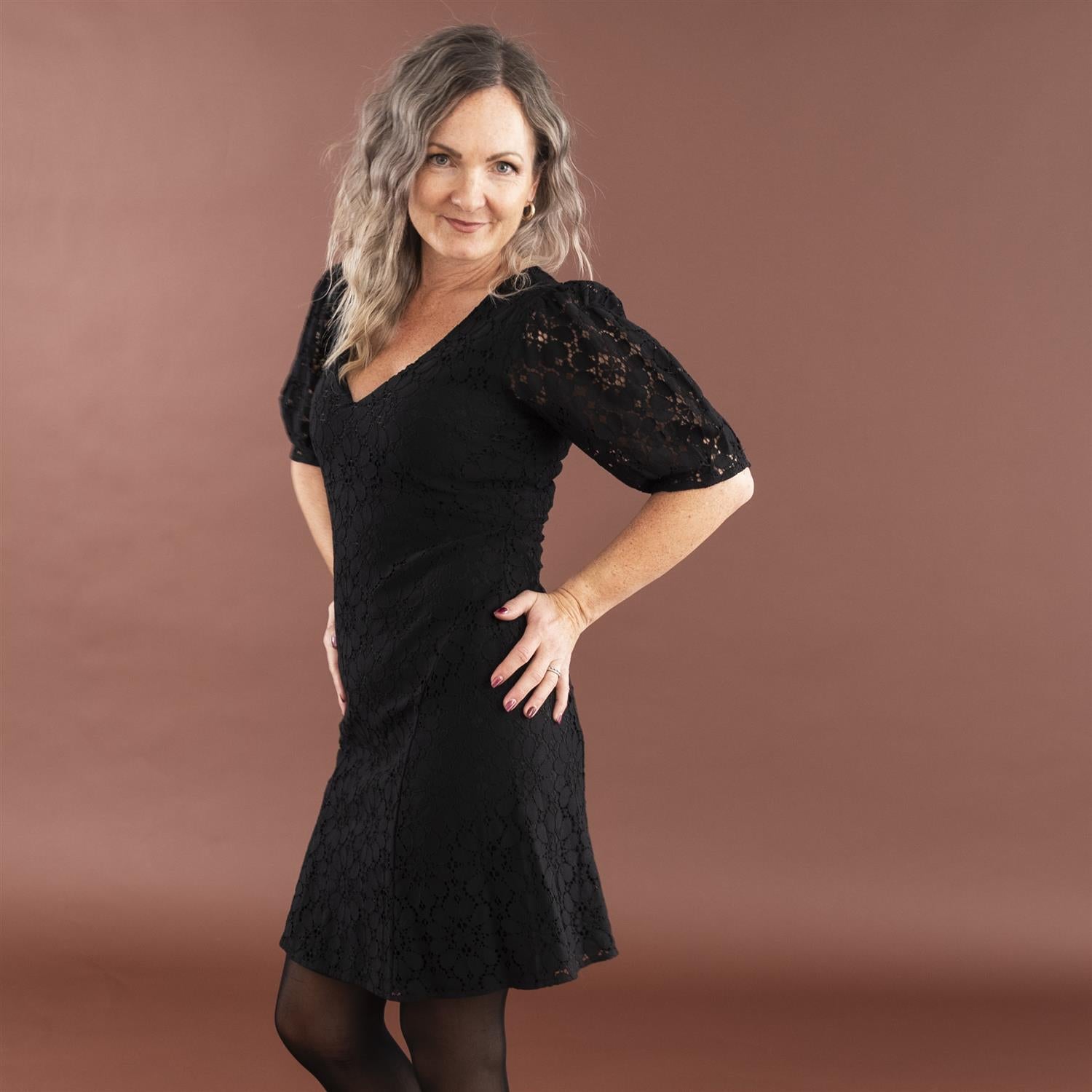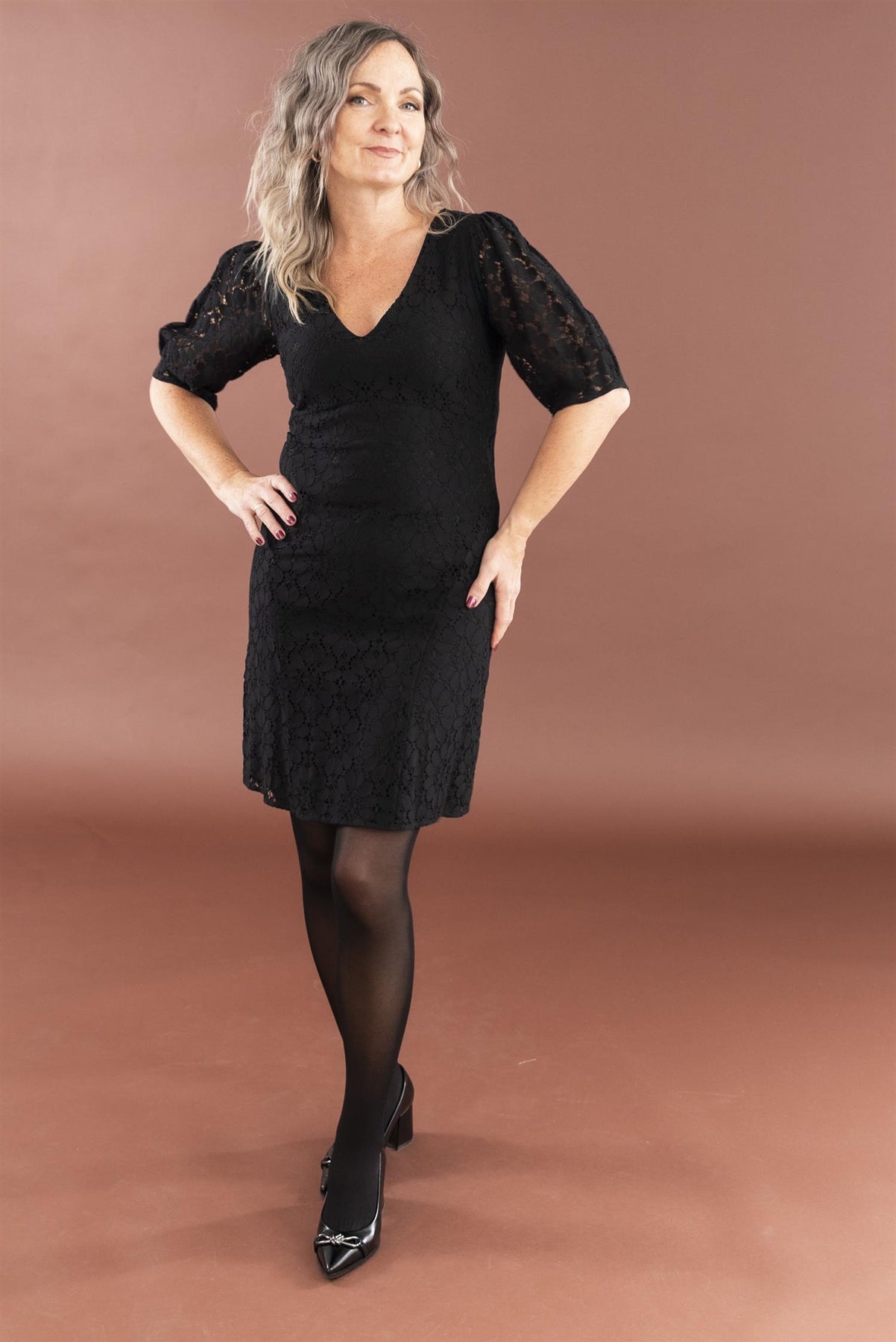 Klassisk sort blondekjole med v-utrigning og pen ermlengde med ørliten vidde.